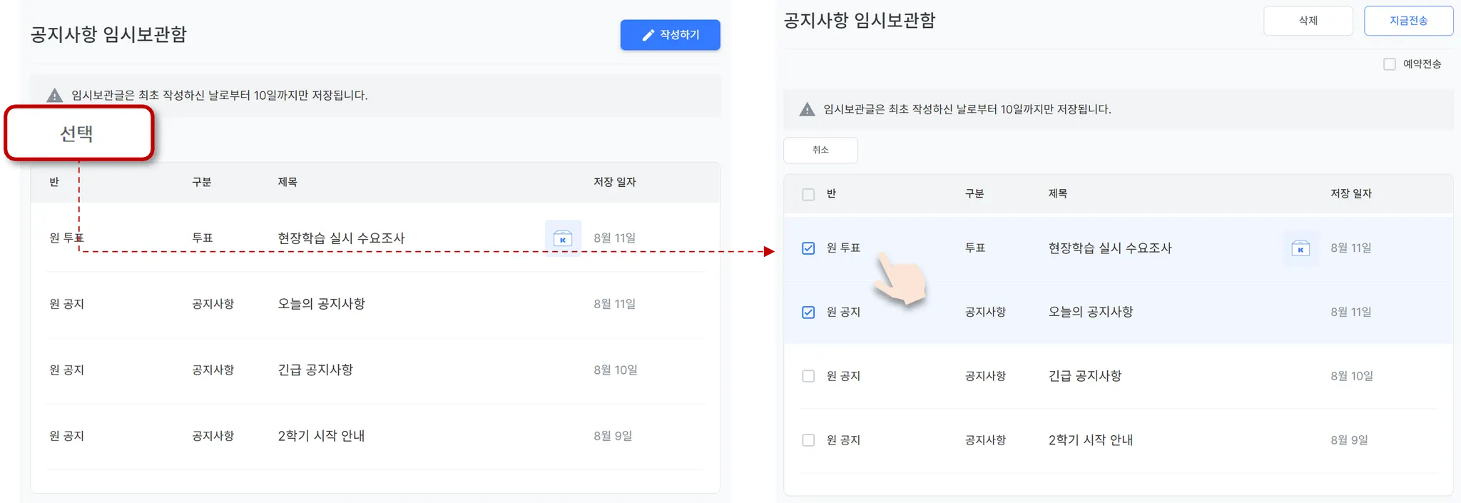 좌측의 선택 버튼을 클릭하면 여러 개의 글을 선택하고 전송, 삭제, 예약 전송 할 수 있어요.