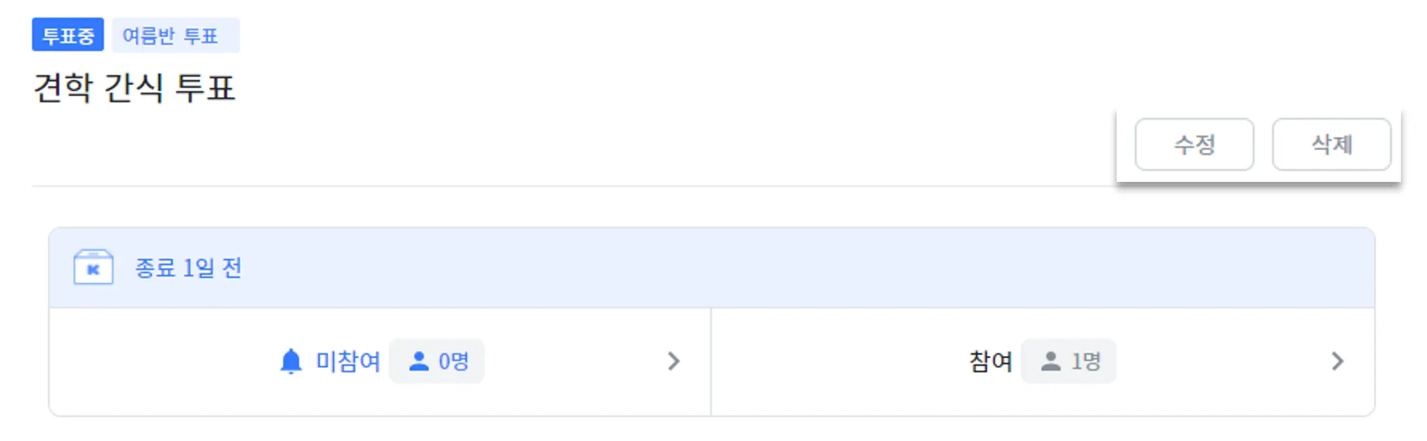 투표 종료 를 선택하면 해당 투표는 더 이상 투표할 수 없습니다. 투표 종료시 멤버들에게 투표 종료 알림이 발송되며, 수정할 수 없습니다.