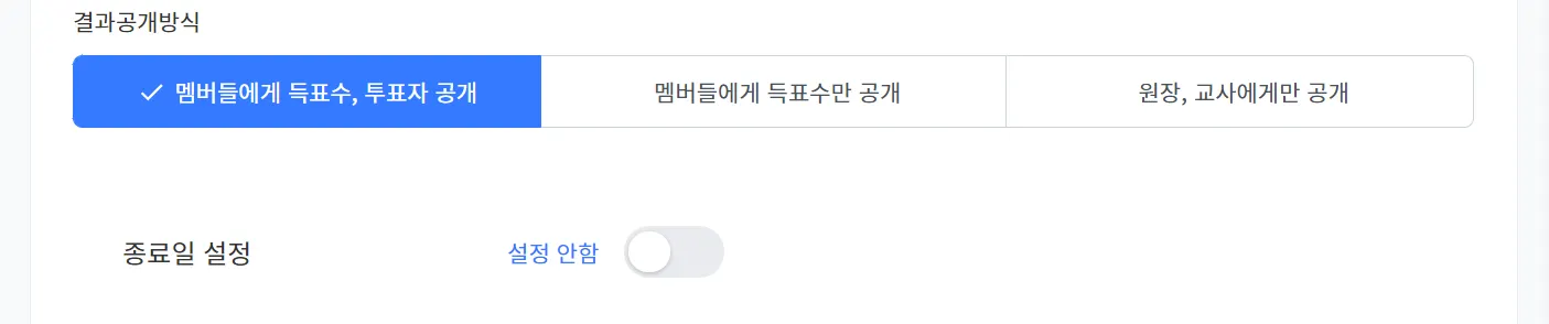 투표 결과공개방식 3가지 중 1가지를 선택하고, 종료일 설정 옵션을 선택해주세요.