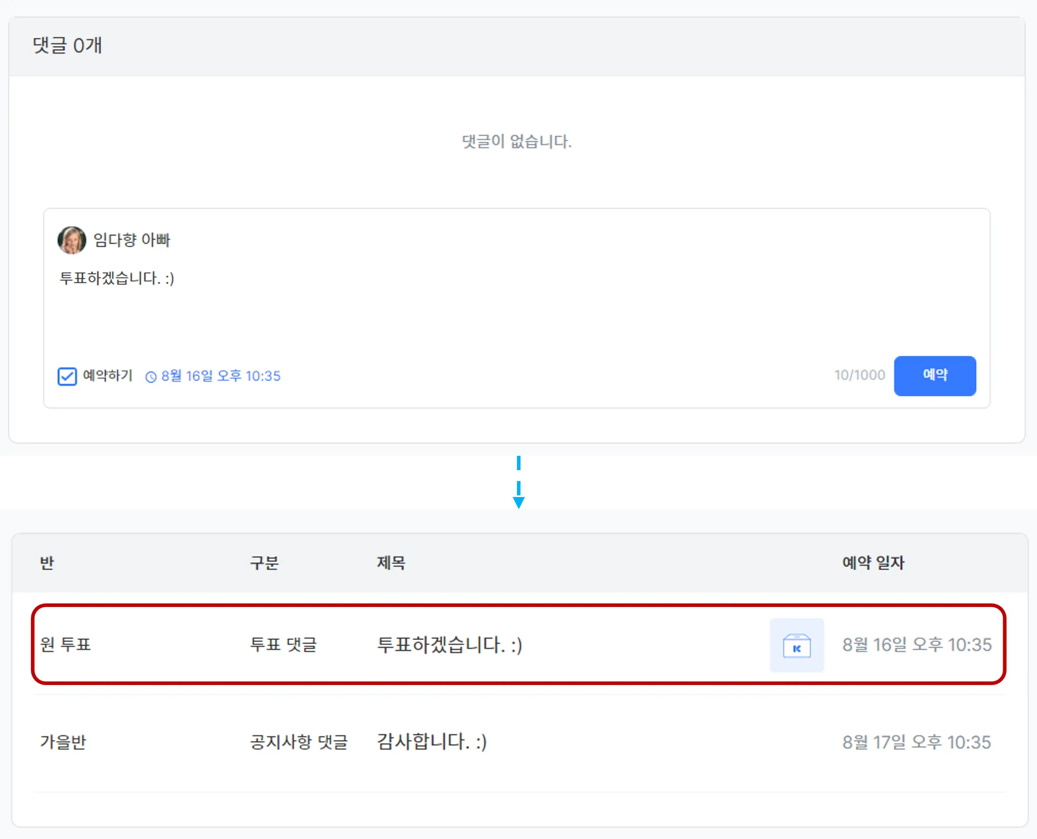 - 예약하기를 선택하면 해당 댓글을 예약하여 설정한 예약시간에 발송할 수 있습니다.