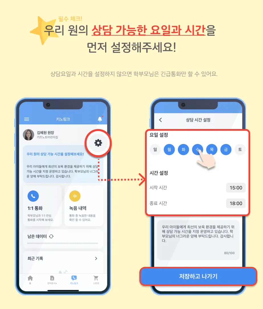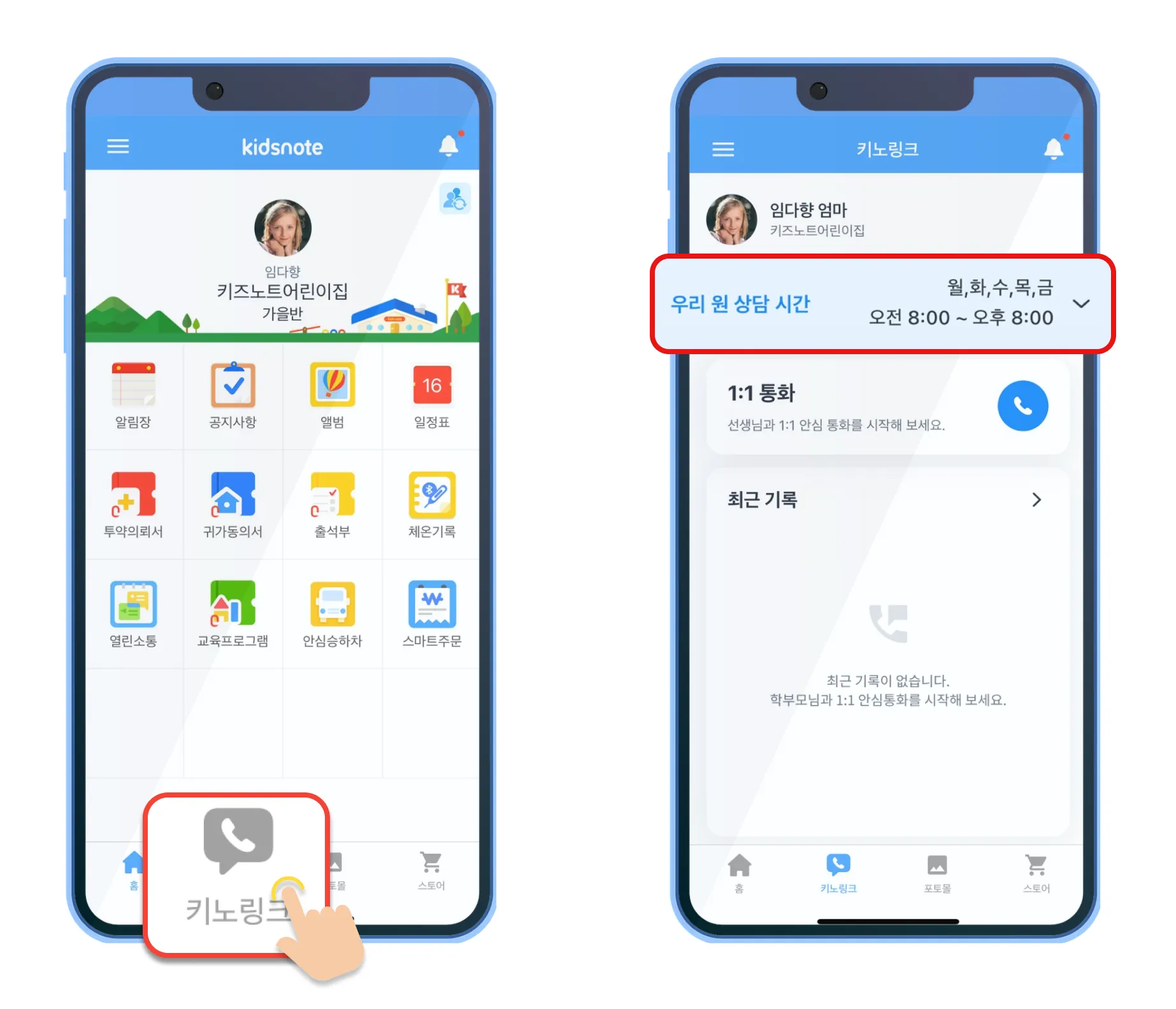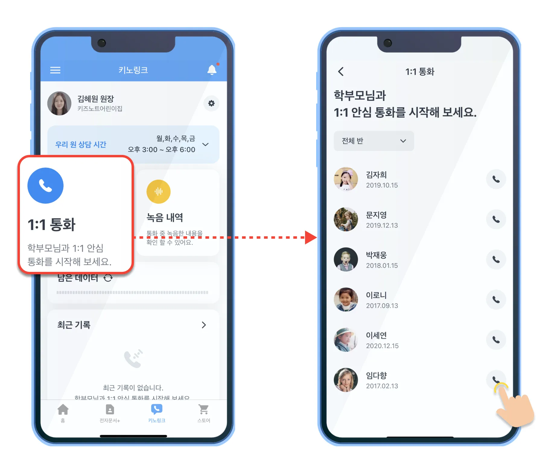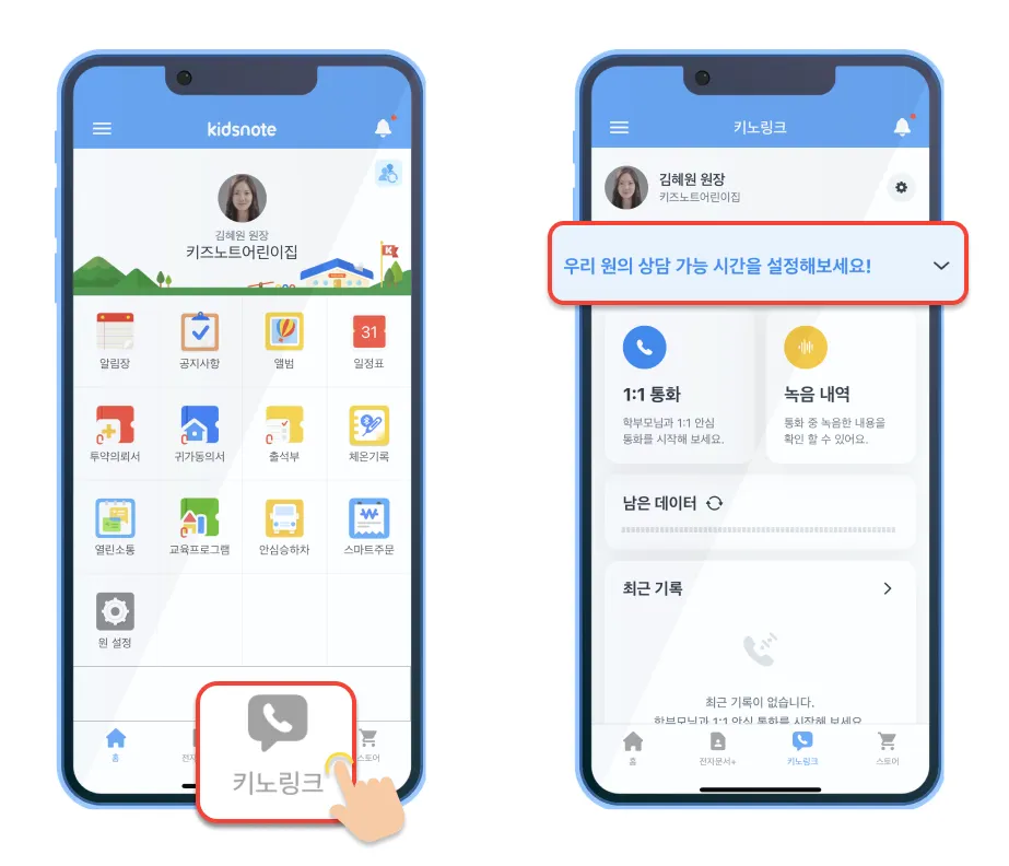 학부모님은 원에서 설정한 상담 시간 내에 키노링크로 원장님 또는 소속반 선생님과 통화를 할 수 있어요.