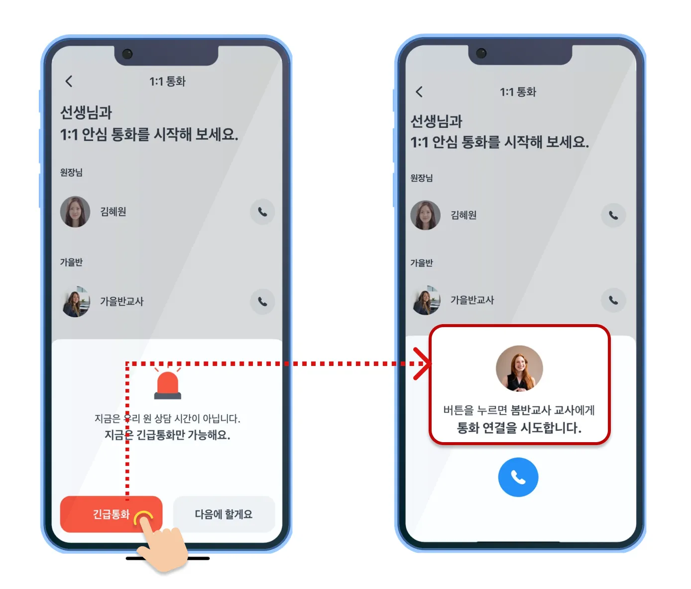 긴급통화시 원장님/소속반 선생님이 아닌 원에서 선택한 비상연락망 선생님과 통화할 수 있으니 꼭 기억해주세요!
