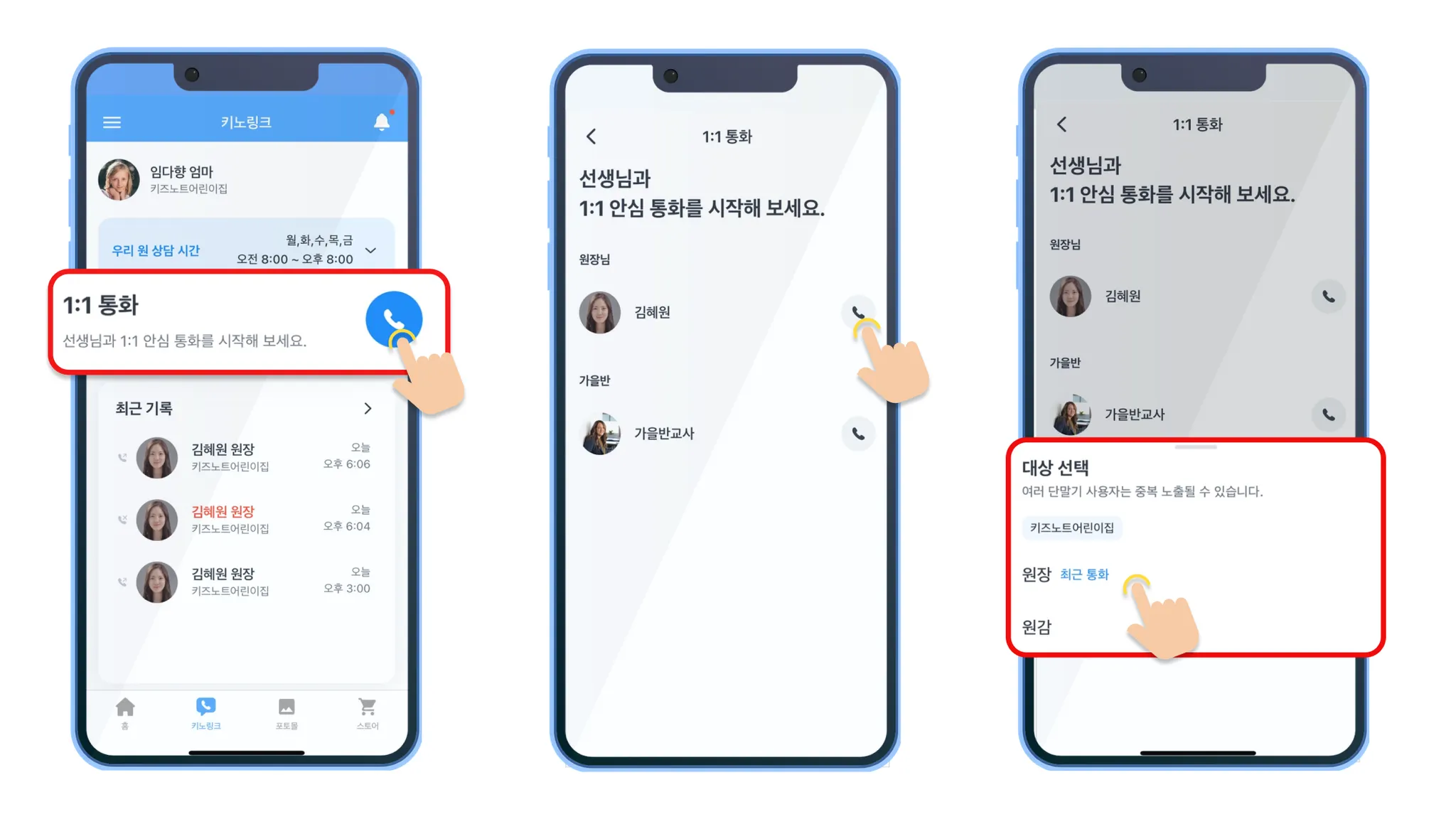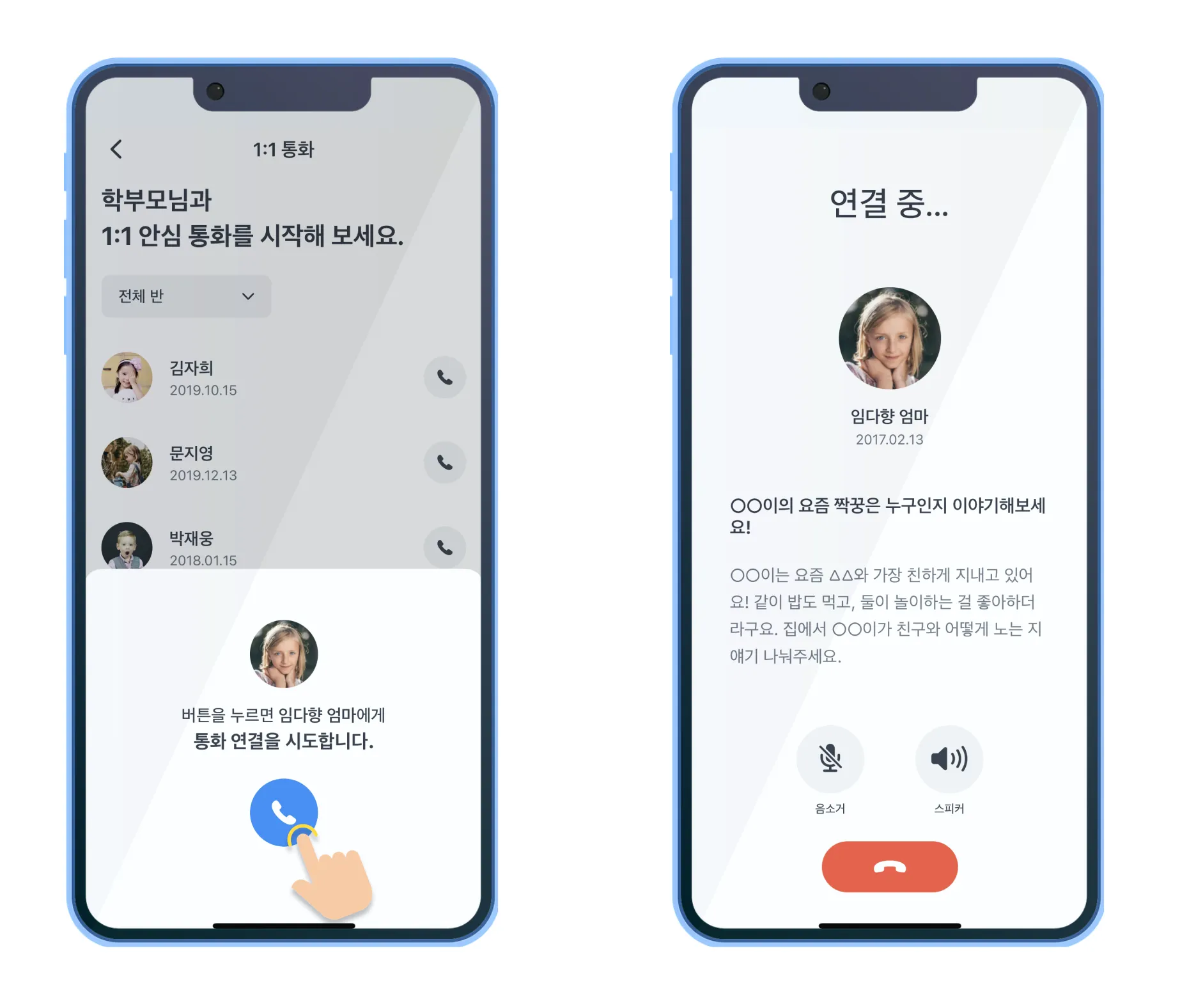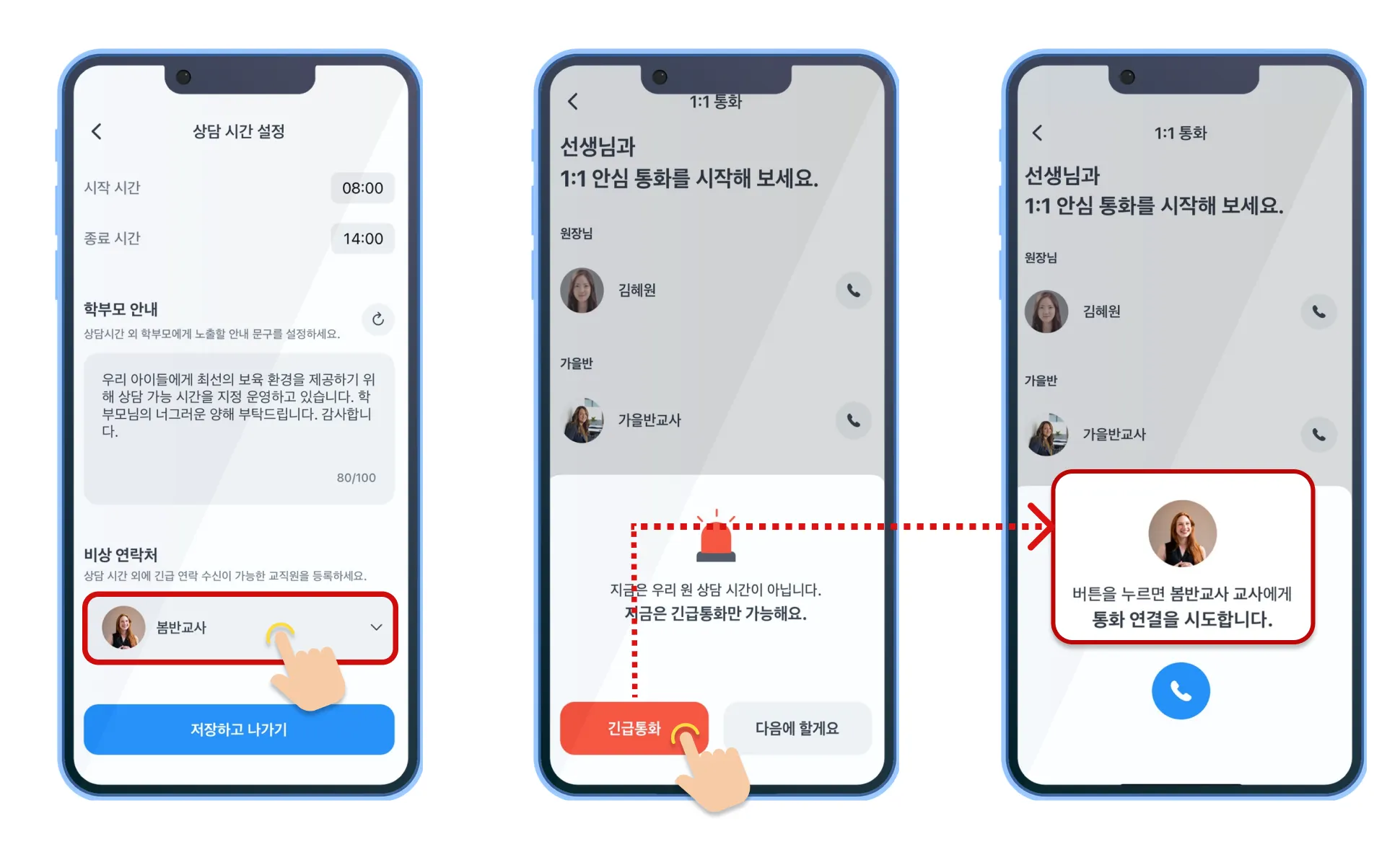 학부모님은 원 상담 시간이 아니라도 긴급한 경우라면 긴급통화도 할 수 있고, 선생님은 원아가 여러명이더라도 호칭별로 통화가 가능해 원하는 학부모님과 바로 소통할 수 있어요!