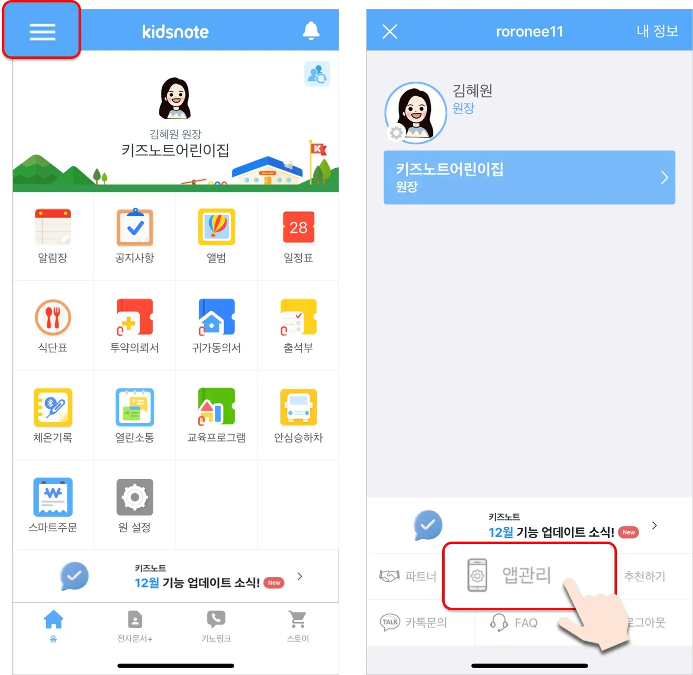 왼쪽 상단의 세줄 아이콘을 눌러 아래의 앱관리를 선택해주세요.
