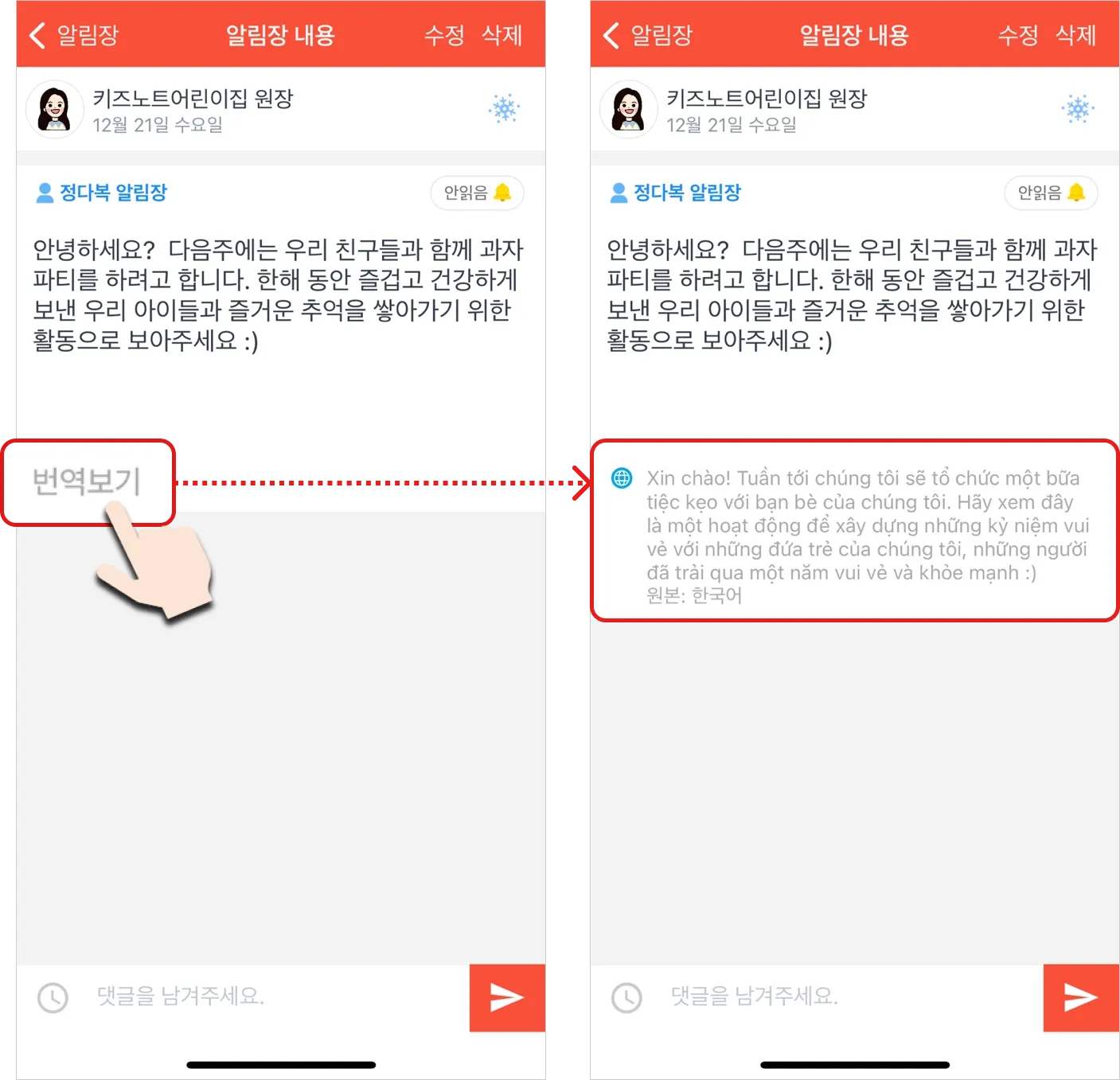 만약 부모님께서 모국어로 알림장을 작성하신다면, 언어를 한국어로 설정하시고 번역보기를 선택해보세요!