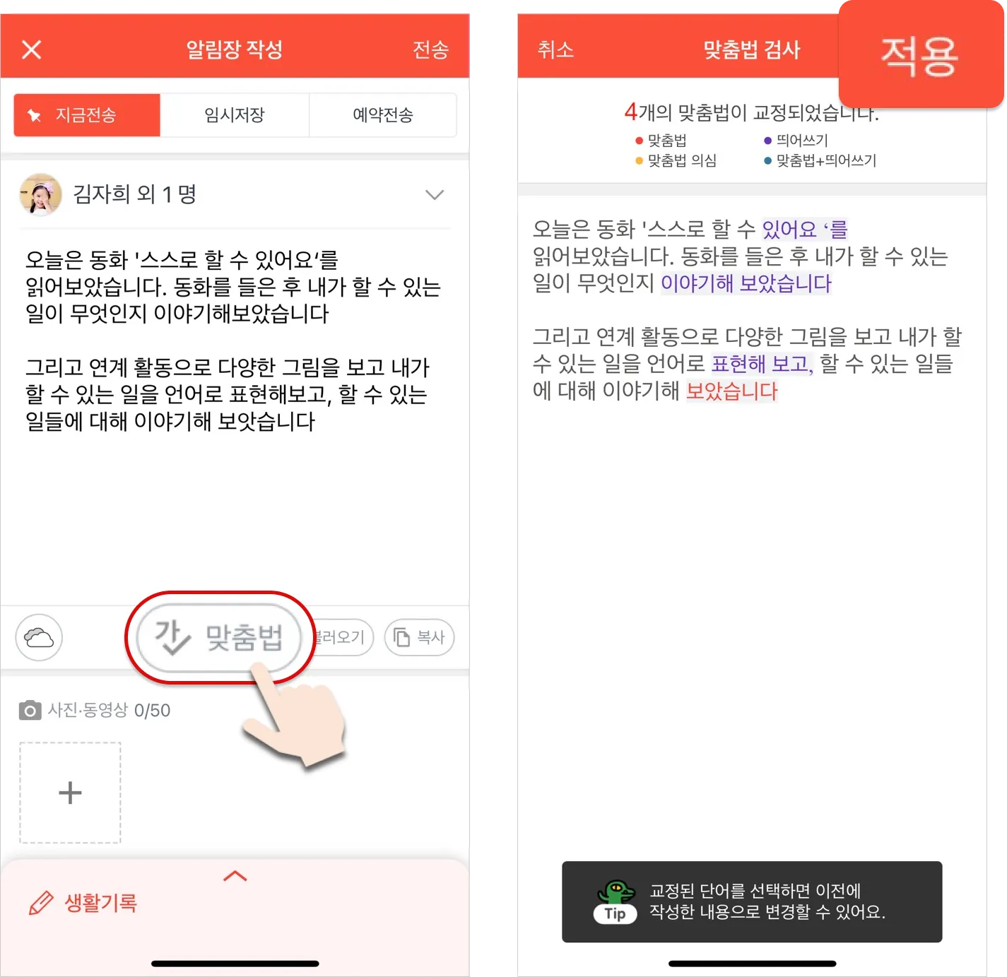 선생님의 품격을 높여줄 키즈노트 맞춤법 기능으로 즐거운 소통을 시작해보세요!