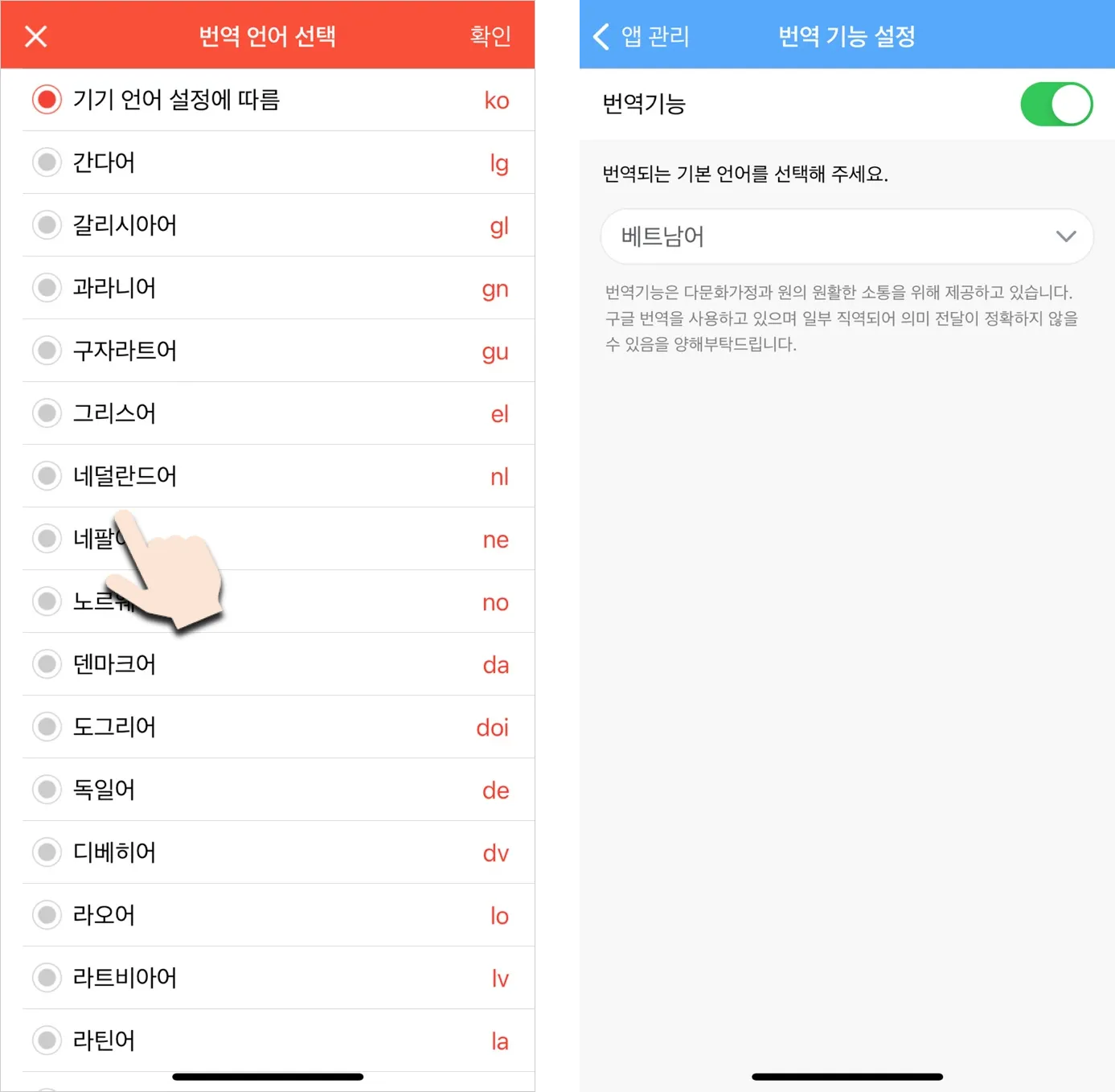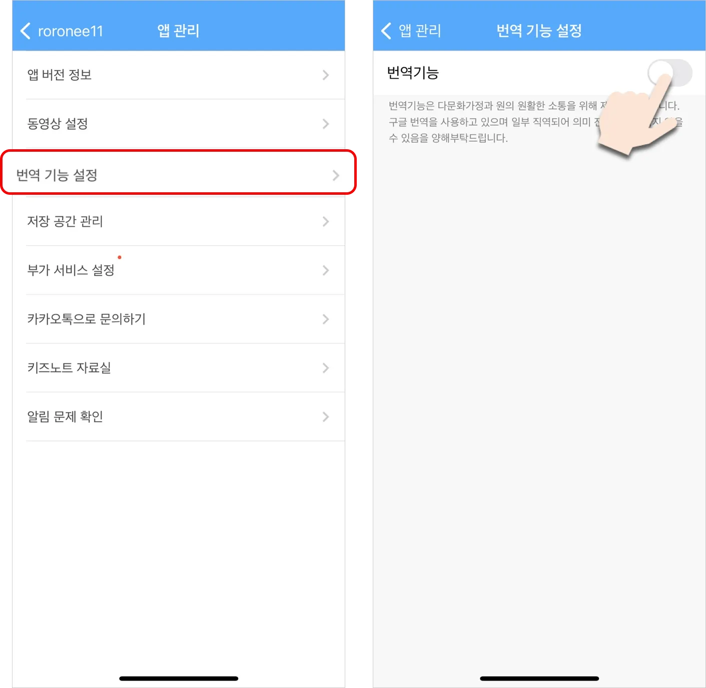 번역 기능 설정을 눌러 번역기능을 켜주세요