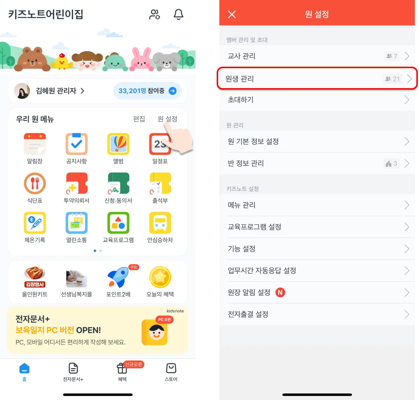 원 설정에서 원생 관리를 선택해주세요. 미승인된 원아가 있을 경우 뱃지 숫자가 표시됩니다.