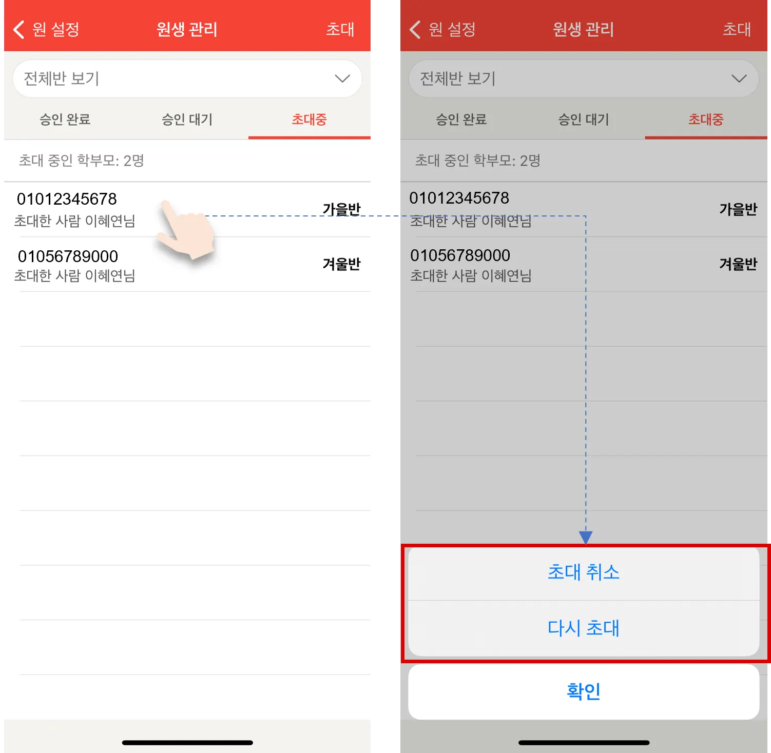 초대 중 목록을 눌러 초대를 취소하거나, 다시 초대로 문자를 재발송 할 수 있습니다.