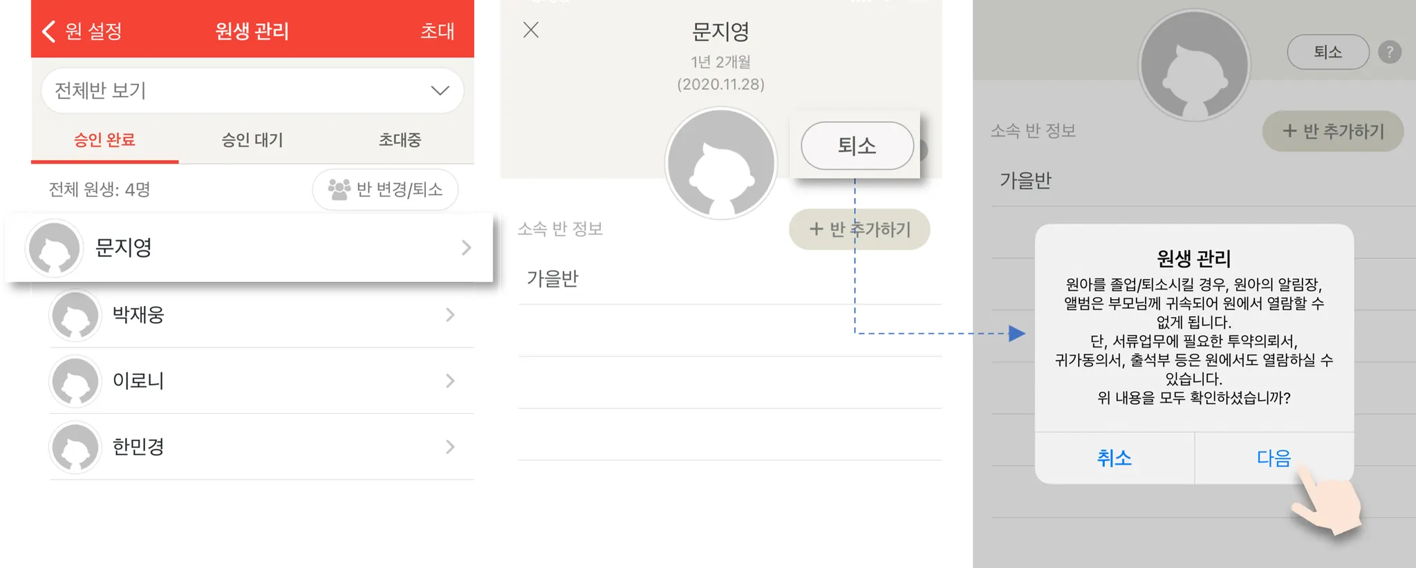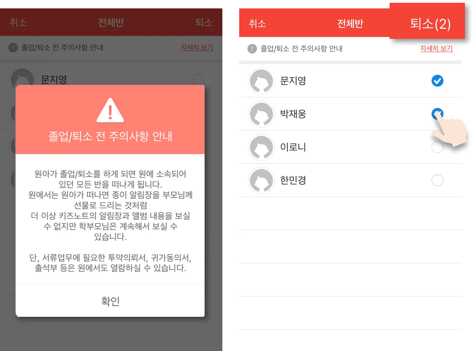 원아가 졸업/퇴소를 하게 되면 원에 소속되어 있던 모든 반을 떠나게 됩니다.