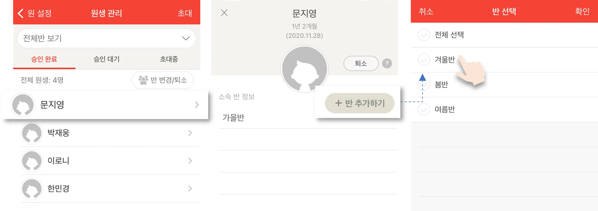 - 반 추가는 기존에 소속되어 있는 반은 유지한 채 새로운 반에 추가로 소속됩니다.