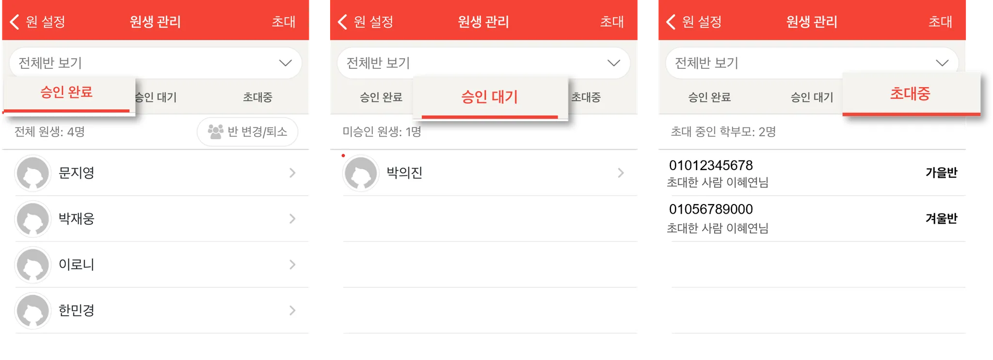 각 탭 별로 승인완료 원아, 승인 대기중 원아, 초대 중인 원아 목록을 확인할 수 있습니다. 또한 우측 상단의 초대를 눌러 원아를 추가로 초대할 수도 있습니다.