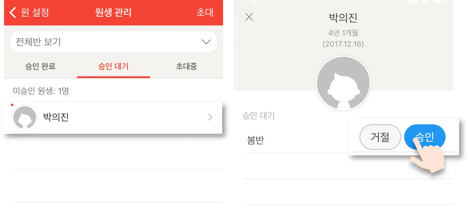 - 원생 승인은 원장/교사 계정으로 가능합니다.