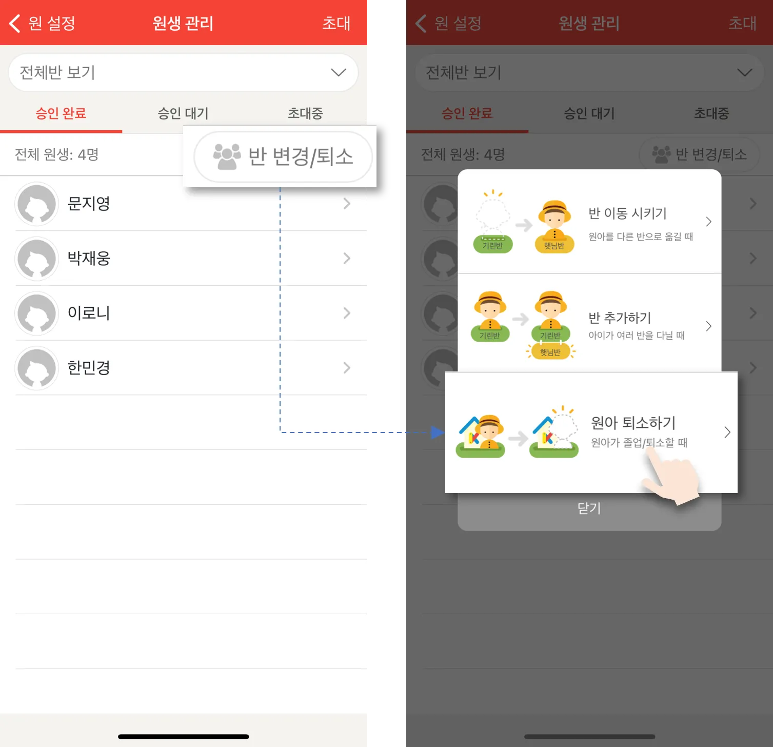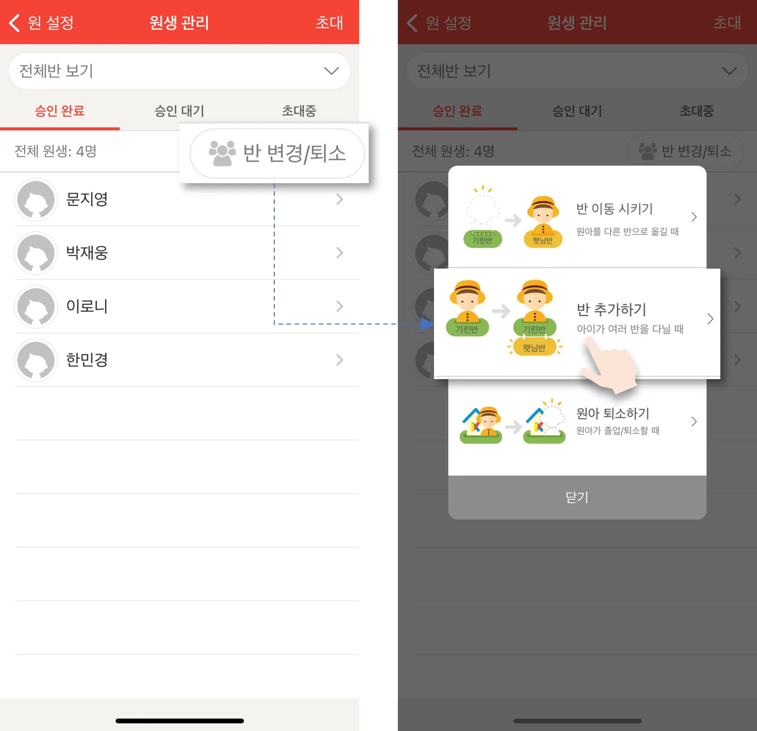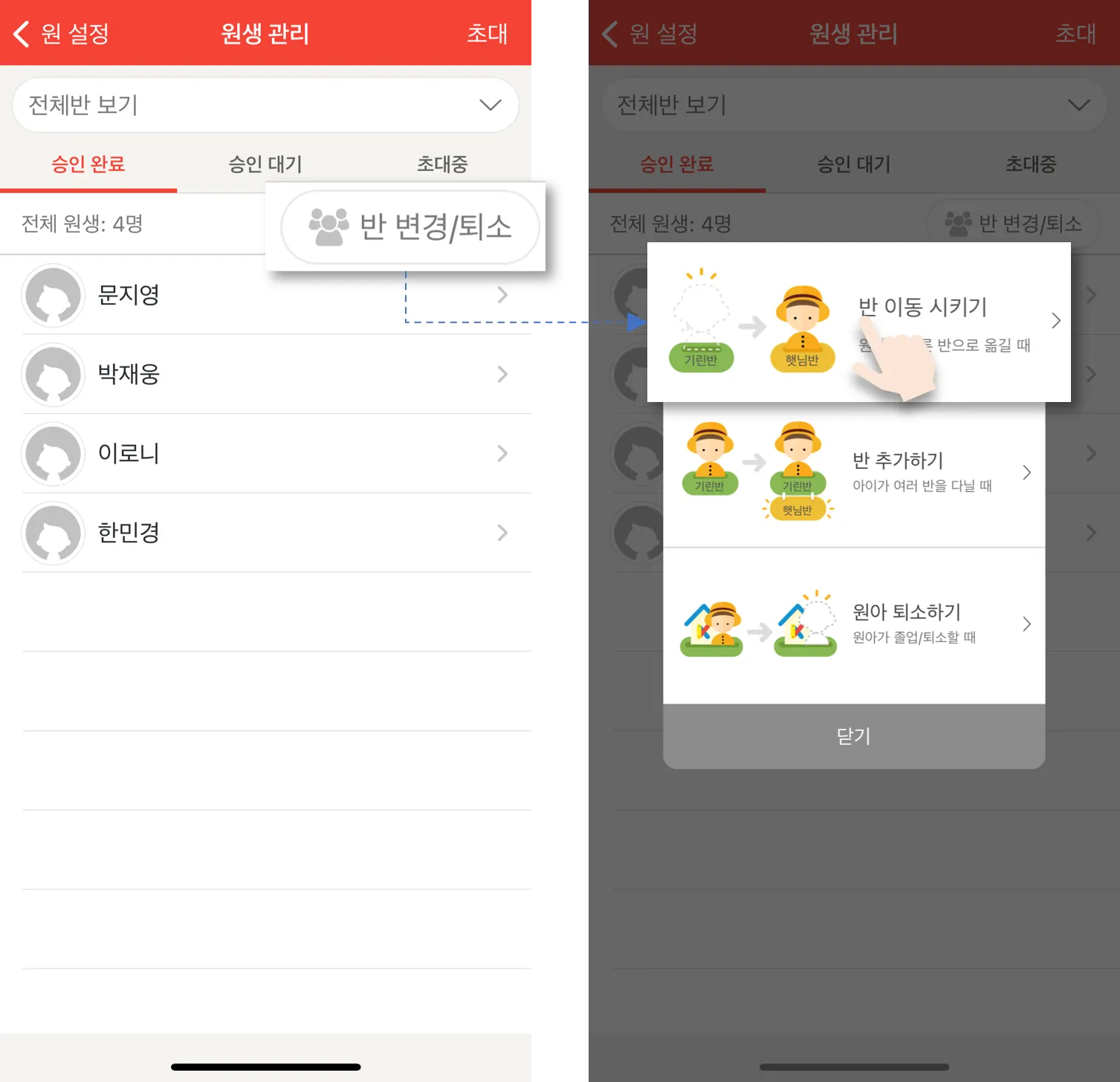 승인 완료 목록에서 반 이동이 필요한 경우 반 변경/퇴소를 선택한 후 반 이동 시키기를 선택해 주세요.