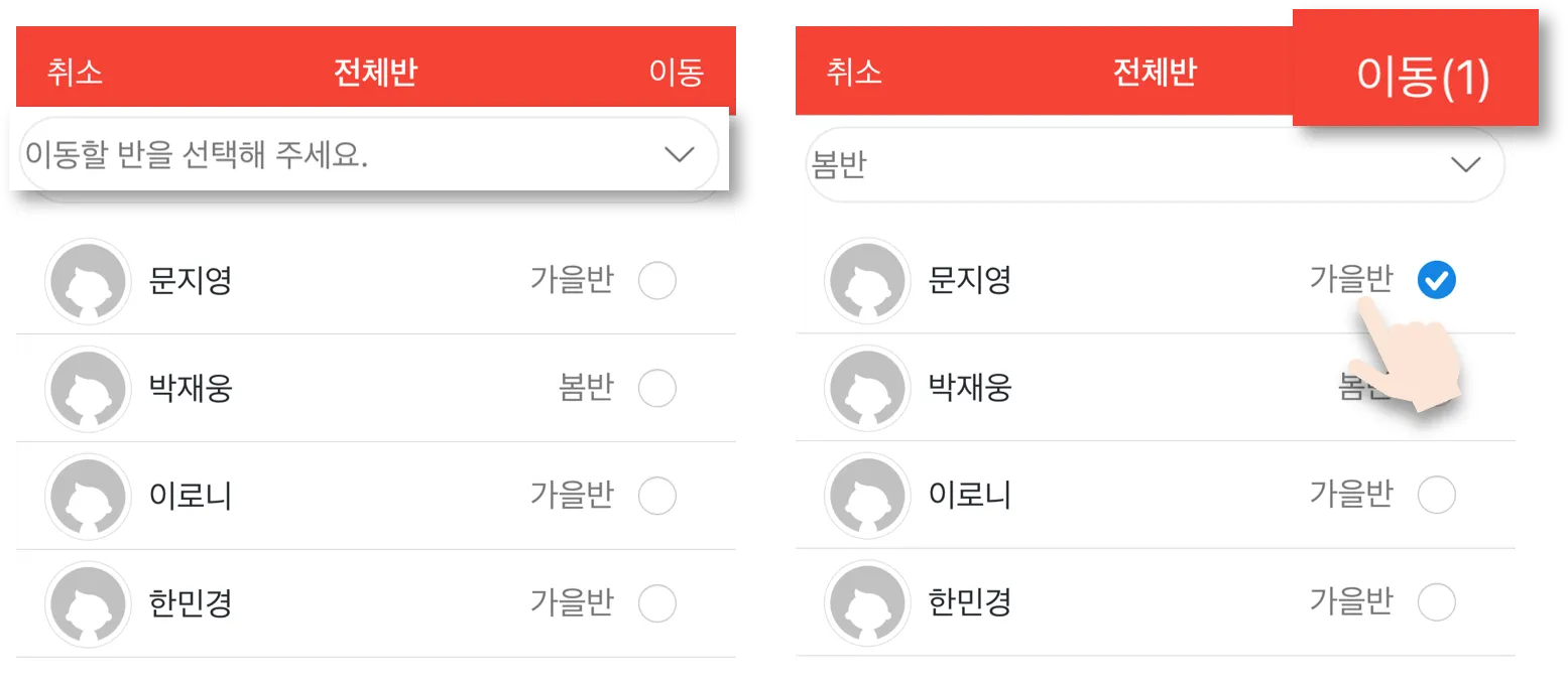 - 반 이동 시 기존에 소속되어 있던 반에서 나와 새로운 반으로 소속됩니다.