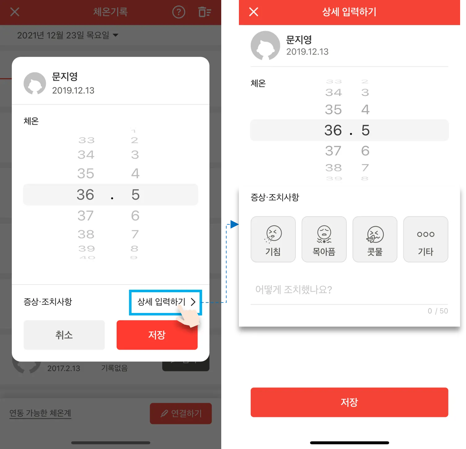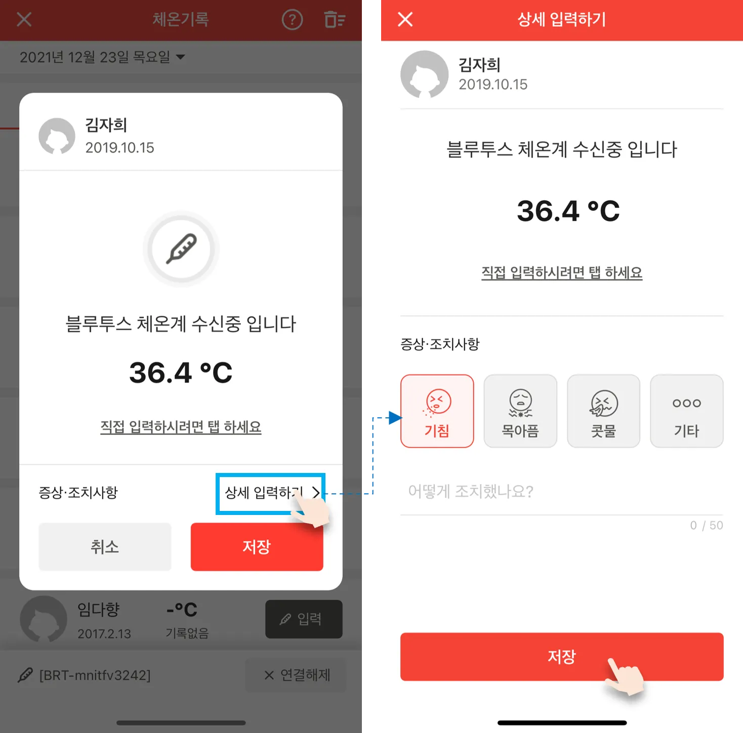 블루투스 체온계 연동 후 체온을 기록하면, 체온계에서 인식한 체온이 바로 반영되어 입력됩니다.