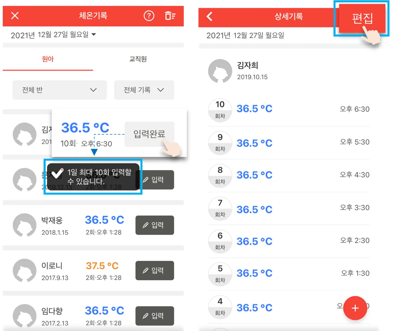 - 10회가 모두 입력되면 ‘입력완료’ 탭으로 변경됩니다. 입력 완료시 추가로 체온 기록을 입력할 수 없으며, 체온을 기록한 해당 원아, 교직원의 상세 페이지에서 횟수 및 측정 기록 내용을 수정/삭제할 수 있습니다.