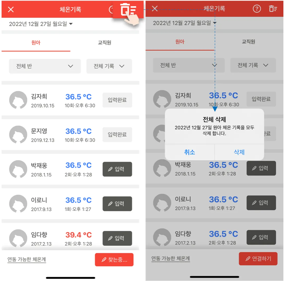 - 날짜별로 체온기록을 삭제하면 체온을 기록한 모든 원아의 체온 기록이 삭제됩니다.