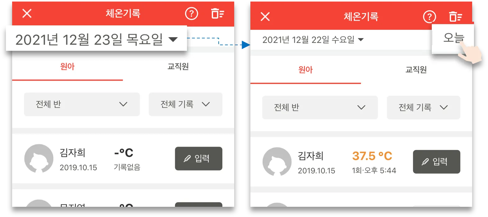 - 날짜 변경시 우측에 ‘오늘’ 탭이 나타나고, 선택하면 당일 체온 기록 목록으로 이동합니다.