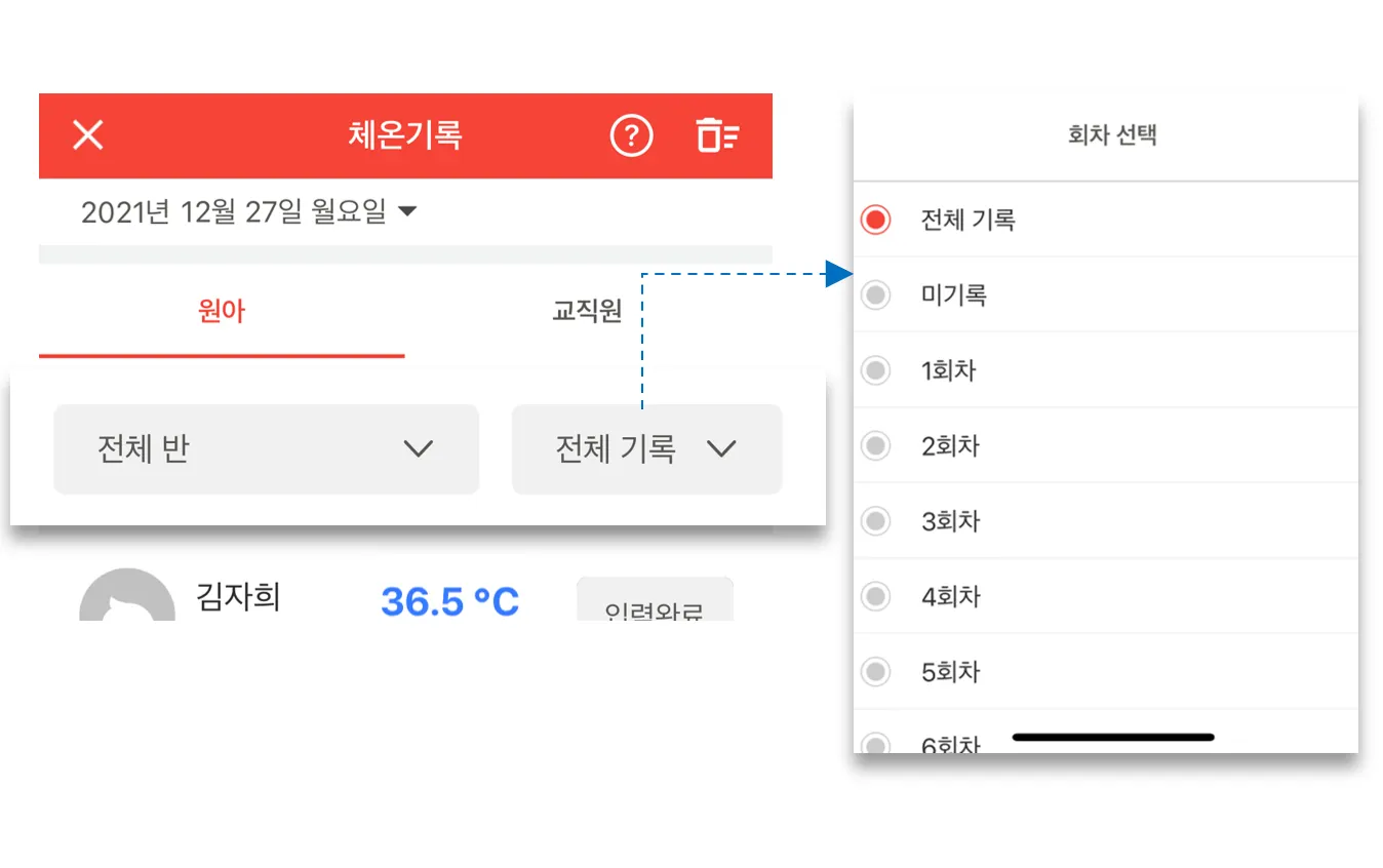 필터를 이용하여 반별, 회차별 체온 기록을 확인할 수 있습니다.