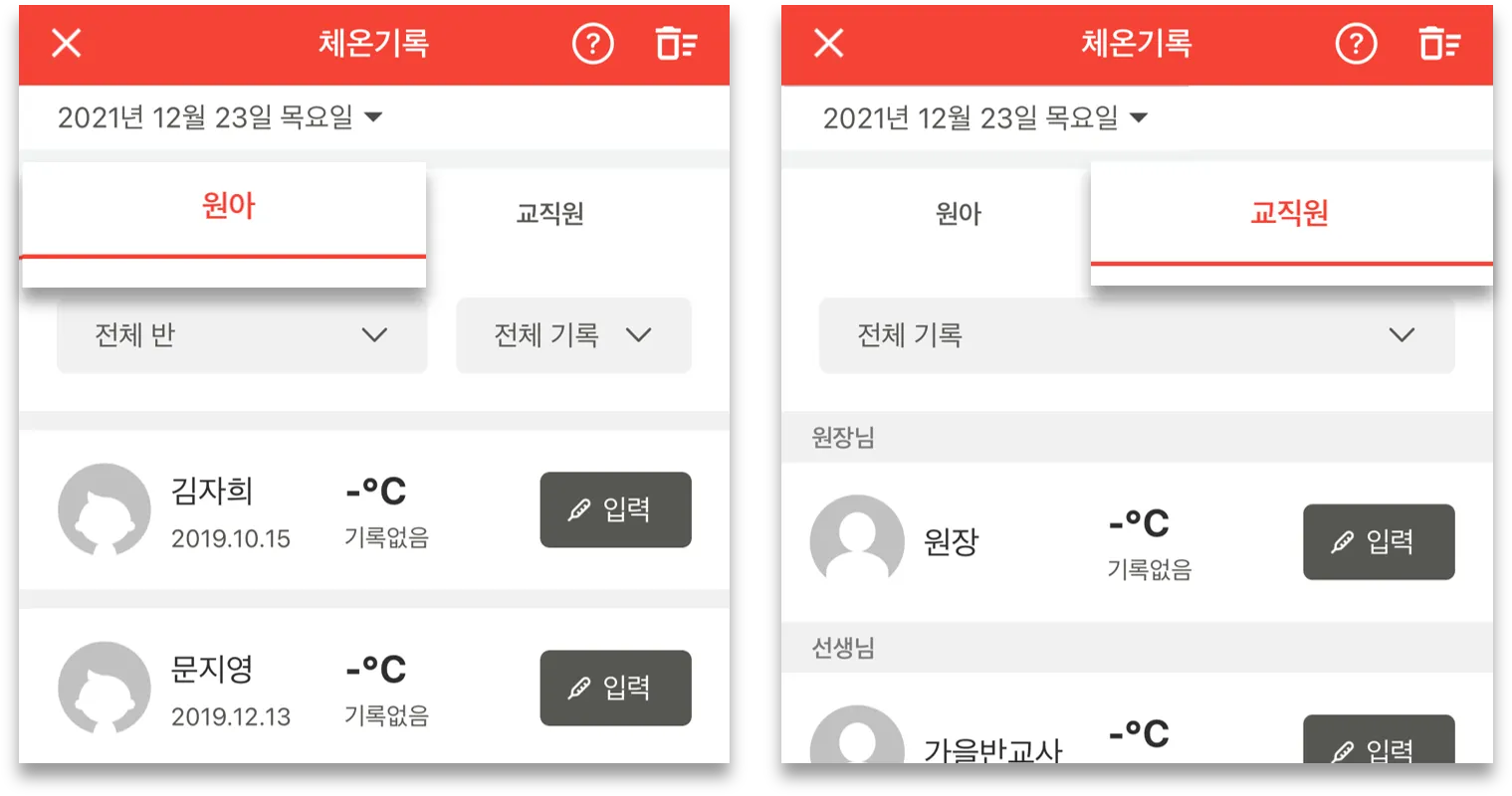 - 권한에 상관없이 모든 교직원이 원내 모든 원아, 교직원의 체온 기록을 수정할 수 있습니다.