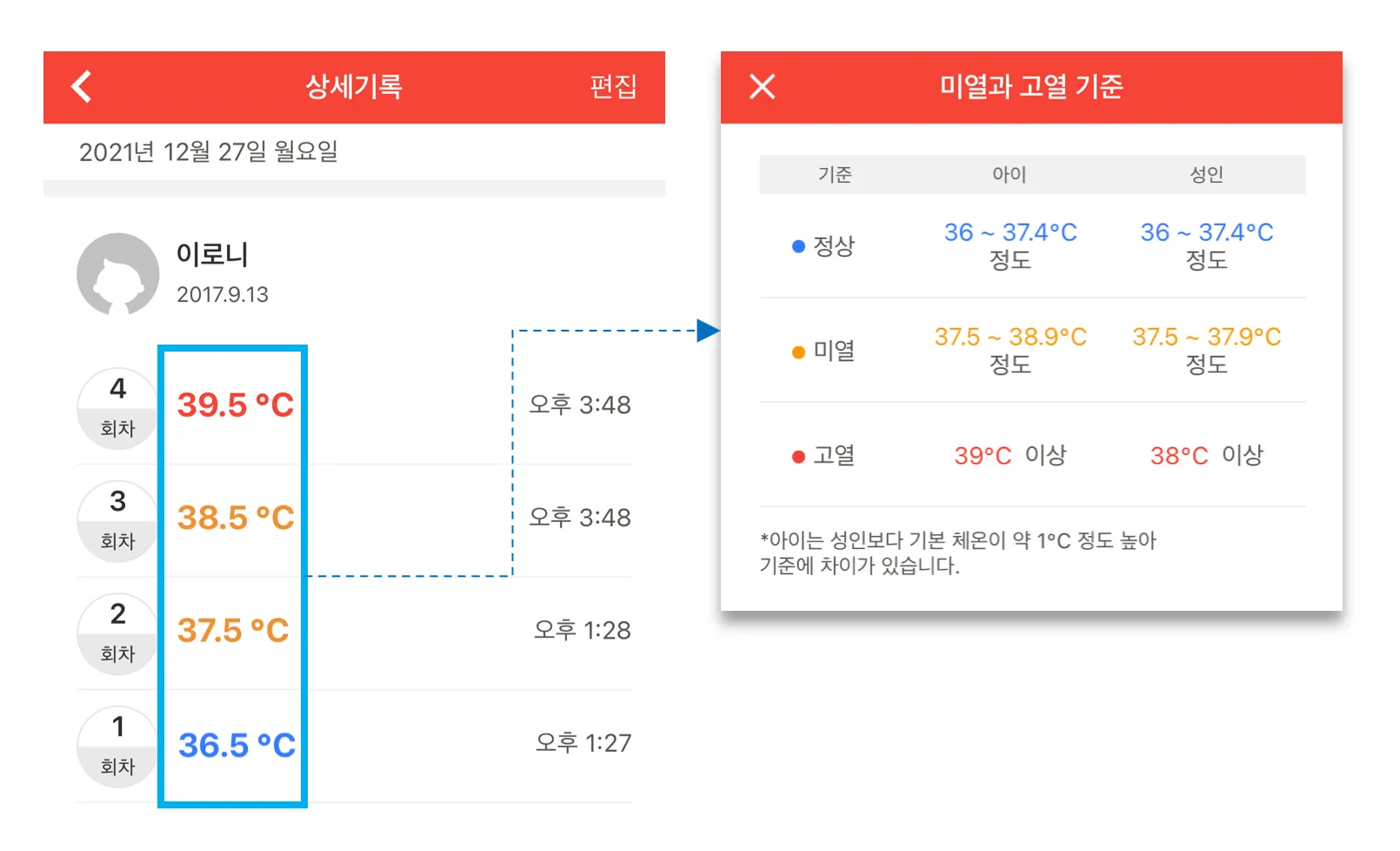 체온기록은 미열과 고열 기준에 따라 색깔이 다르게 표시됩니다.
