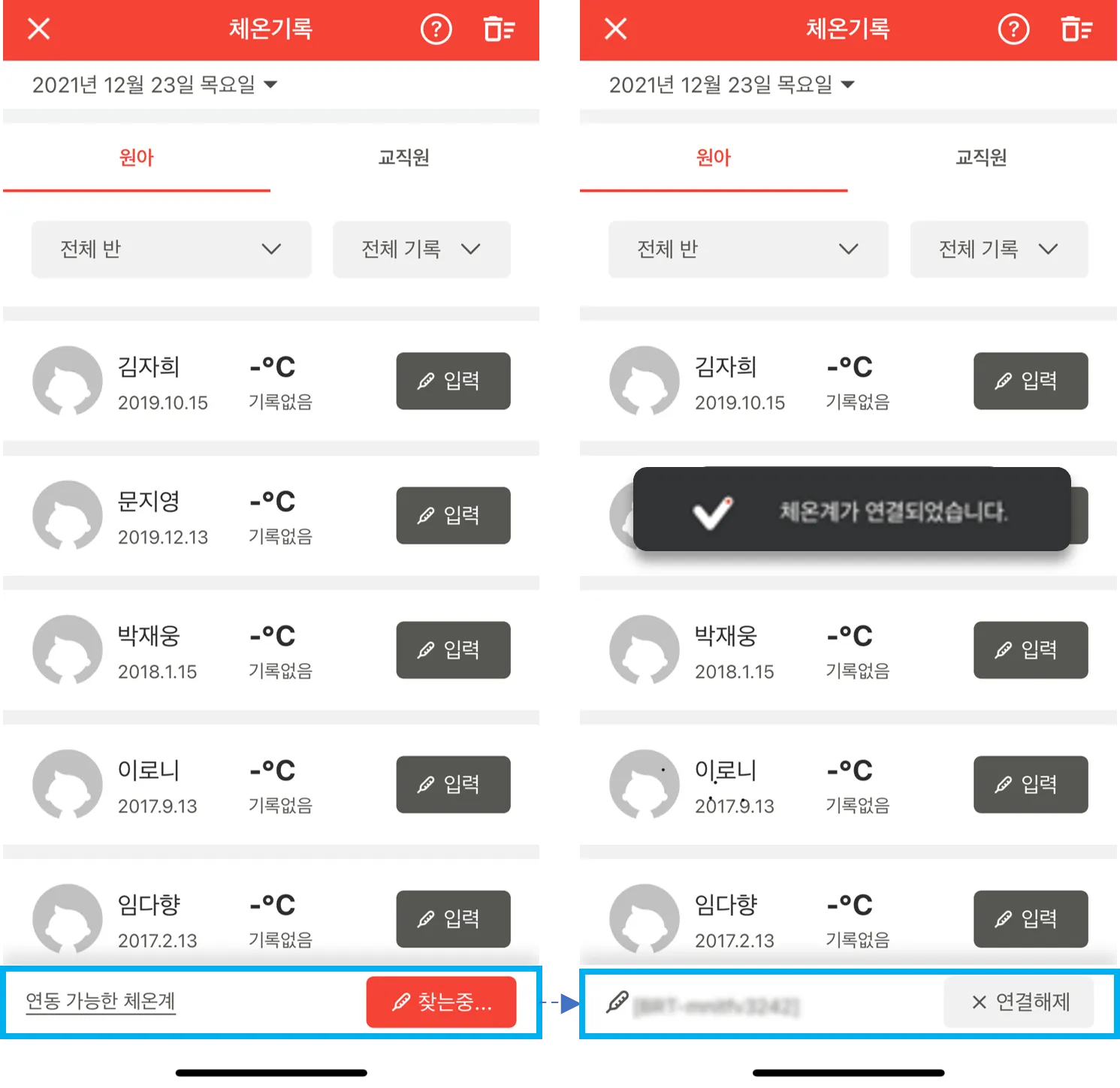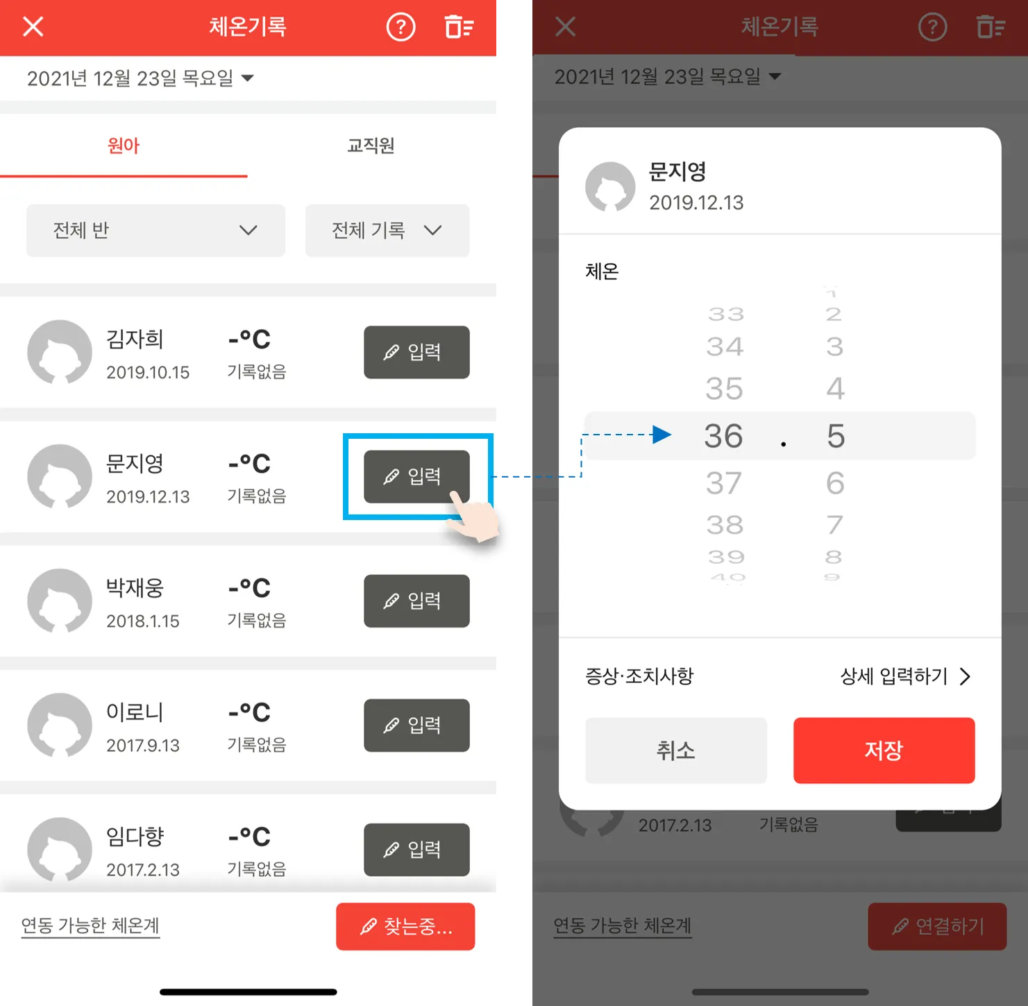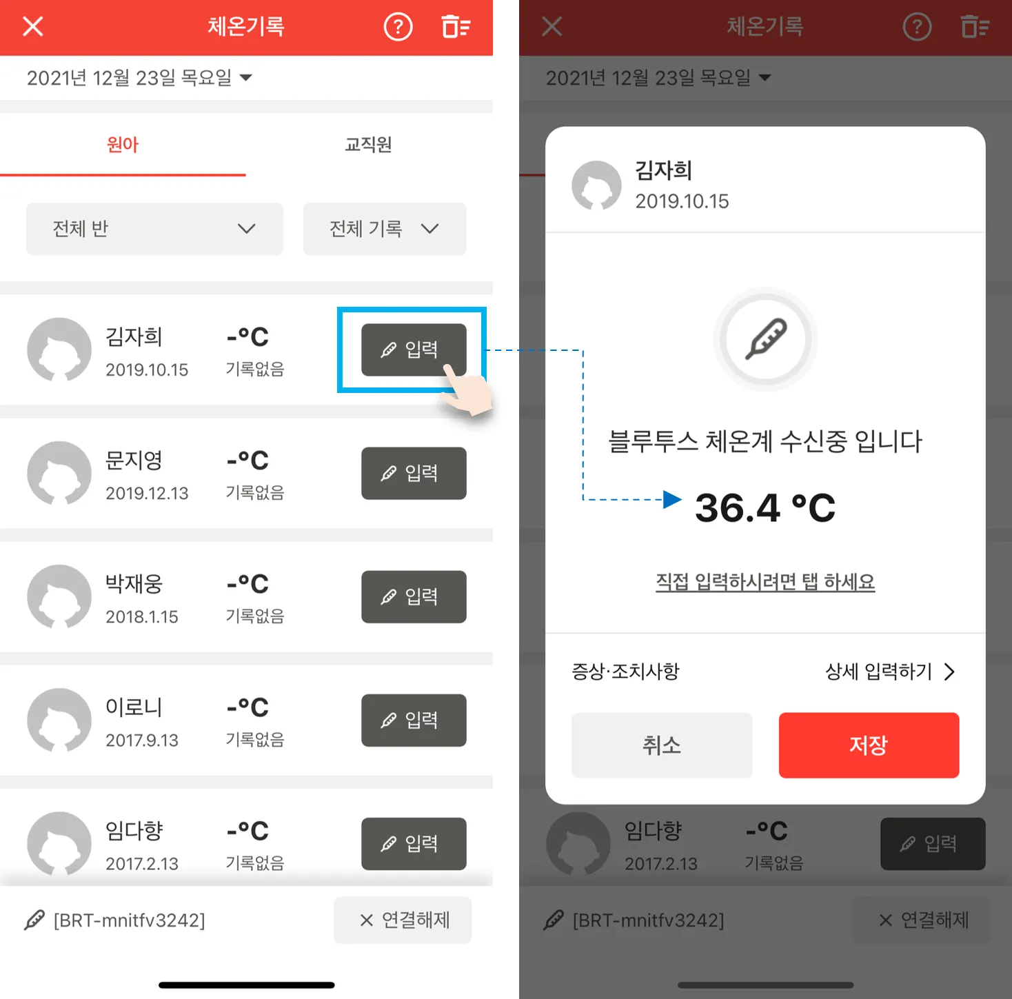 체온을 기록할 원아, 교직원 우측의 입력버튼을 선택하면 체온 기록 팝업이 나타나고, 블루투스 체온계로 체온을 재면 자동으로 측정한 체온 기록이 나타납니다.