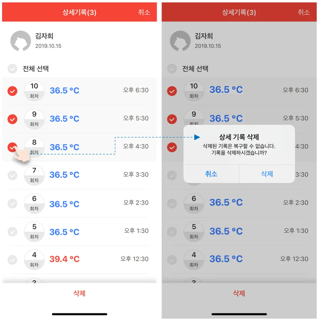 체온 기록을 날짜별, 회차별로 삭제할 수 있습니다.