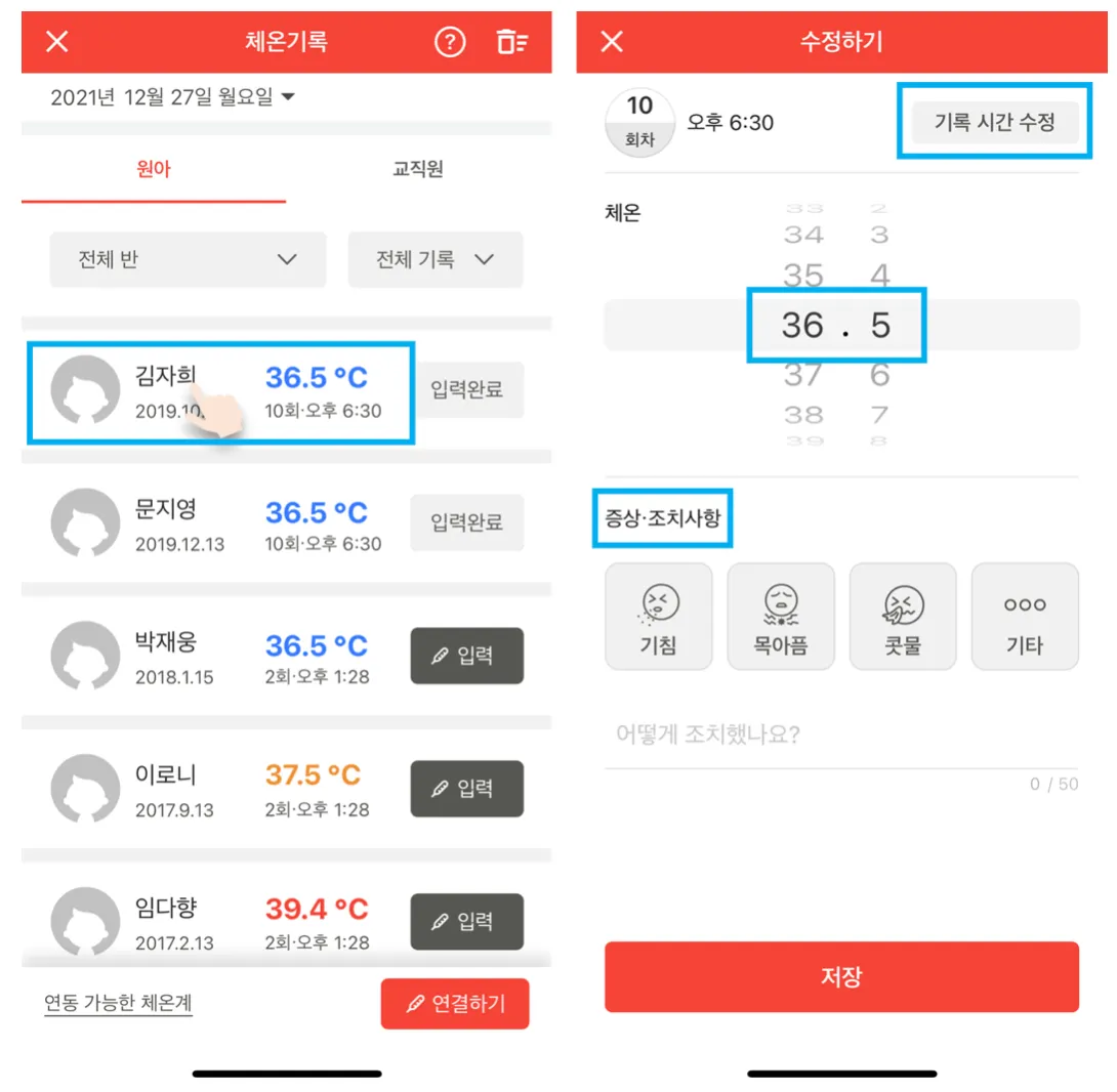 일반 체온계로 체온 측정 후, 체온 측정 결과를 원아, 교직원별로 입력할 수 있습니다.