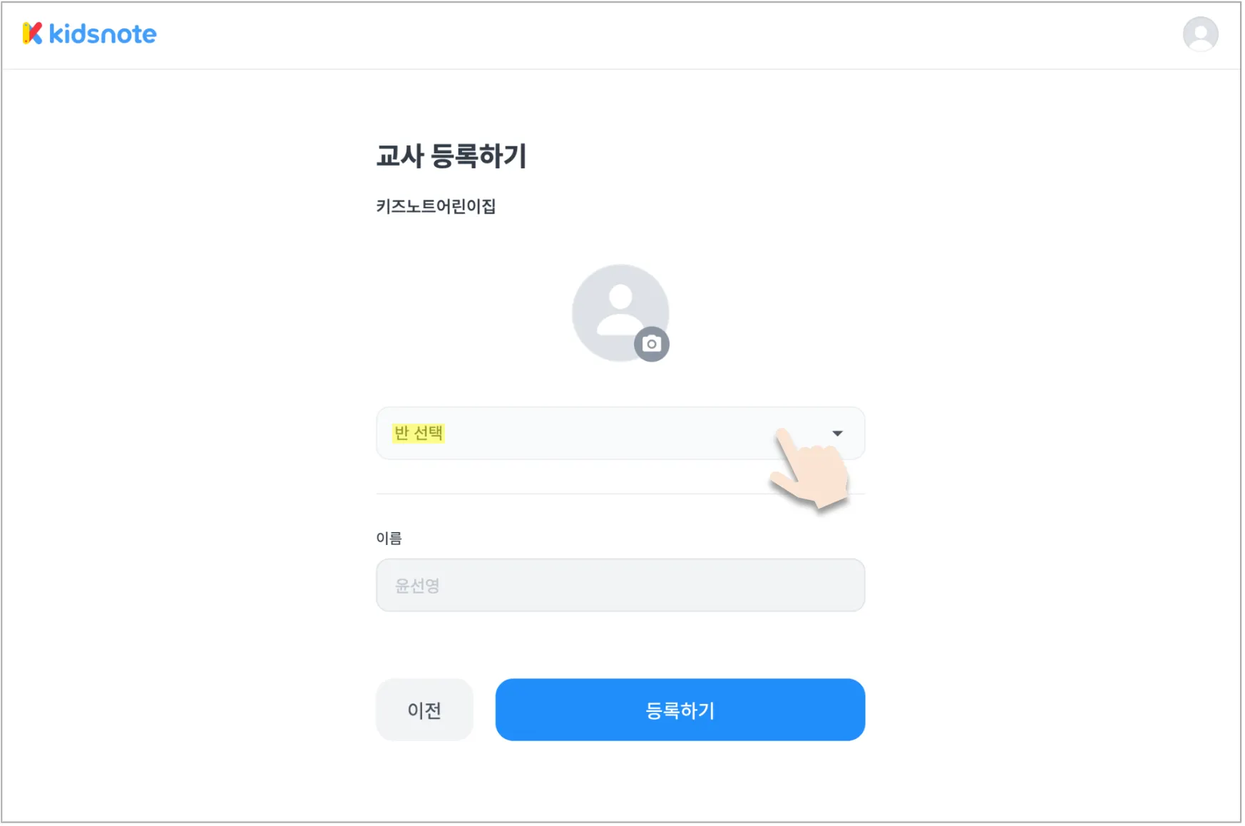 해당 원에서 소속될 반과 노출될 프로필 사진을 선택한 후 등록하기를 눌러 주세요.
