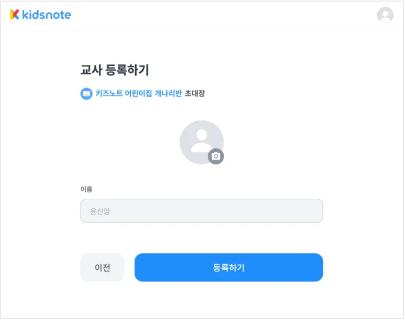 초대장을 선택하면 어린이집, 소속 반 명이 표시됩니다. 노출될 프로필 사진을 선택한 후 등록하기를 눌러주세요.