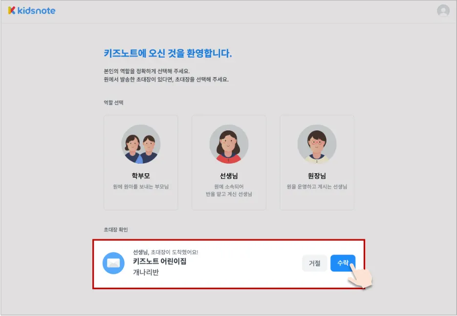 역할등록 페이지 하단의 선생님 초대장 내용을 확인하시고 수락을 눌러 주세요.