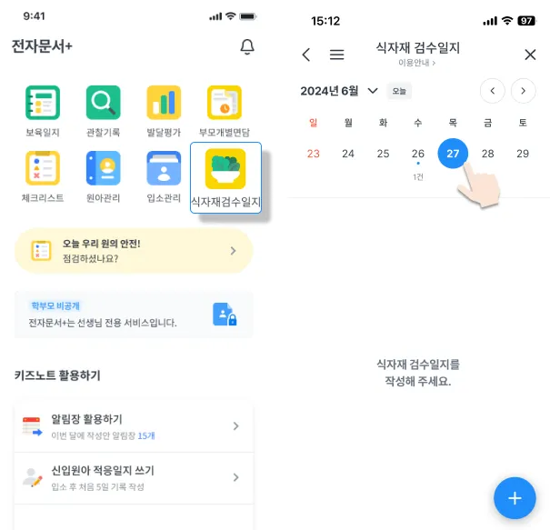 집단급식소 급식안전관리 기준에 따른 키즈노트 식자재 검수일지를 작성해 보세요.