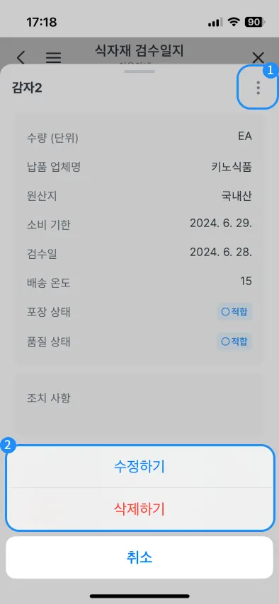 식자재 검수일지 상세 화면에서 ≡ 아이콘을 클릭하여 수정 또는 삭제할 수 있어요.