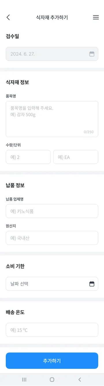 식재료를 납품받아 사용하는 품목에 대해 작성해 주세요. 하루 최대 100개의 식재료를 추가하여 작성할 수 있습니다.