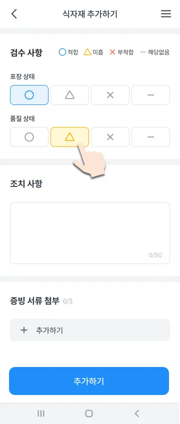 해당 품목의 포장 상태/품질 상태에 따라 적합 O, 미흡 △, 부적합 X, 해당없음 - 을 선택해 주세요.