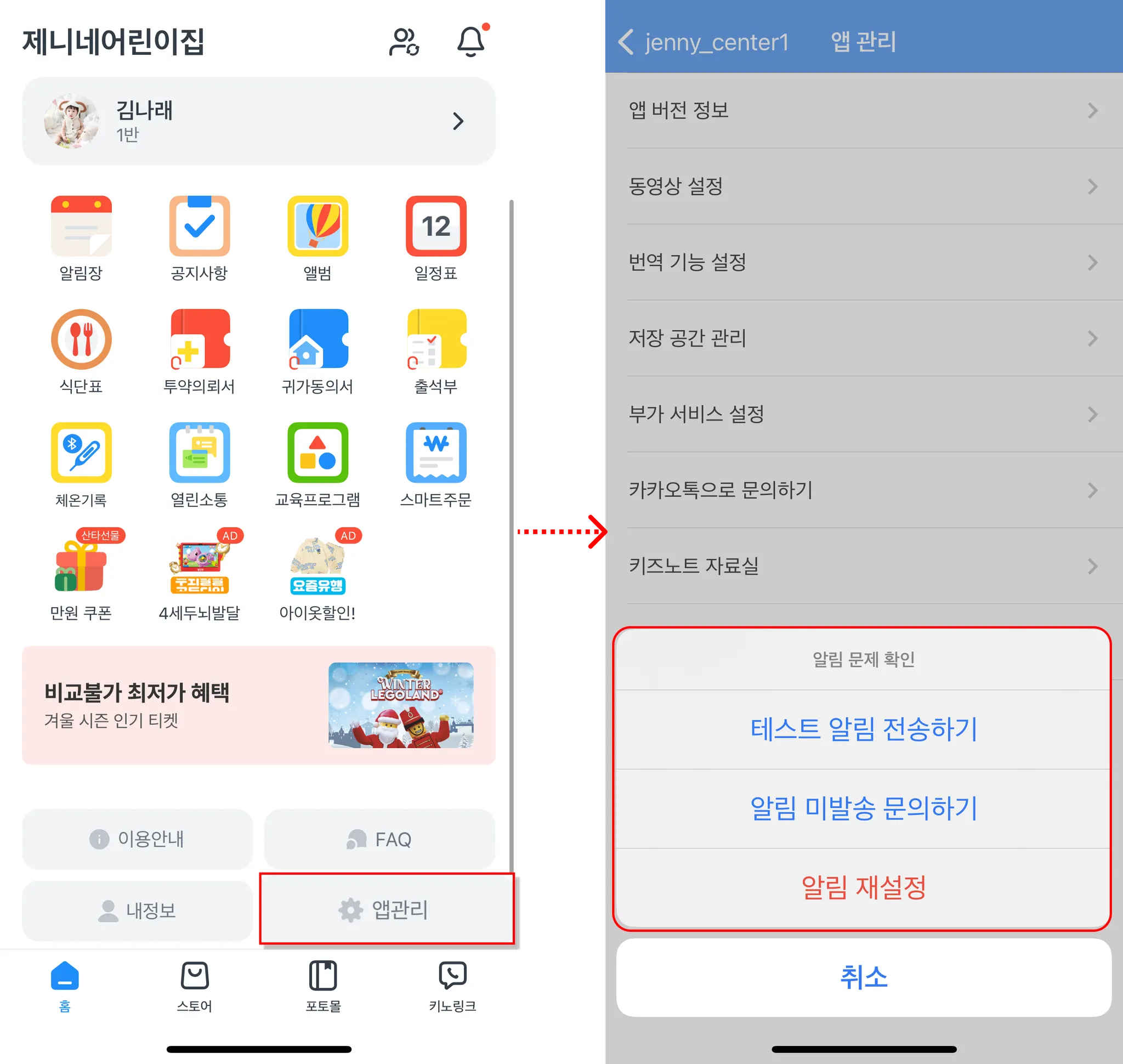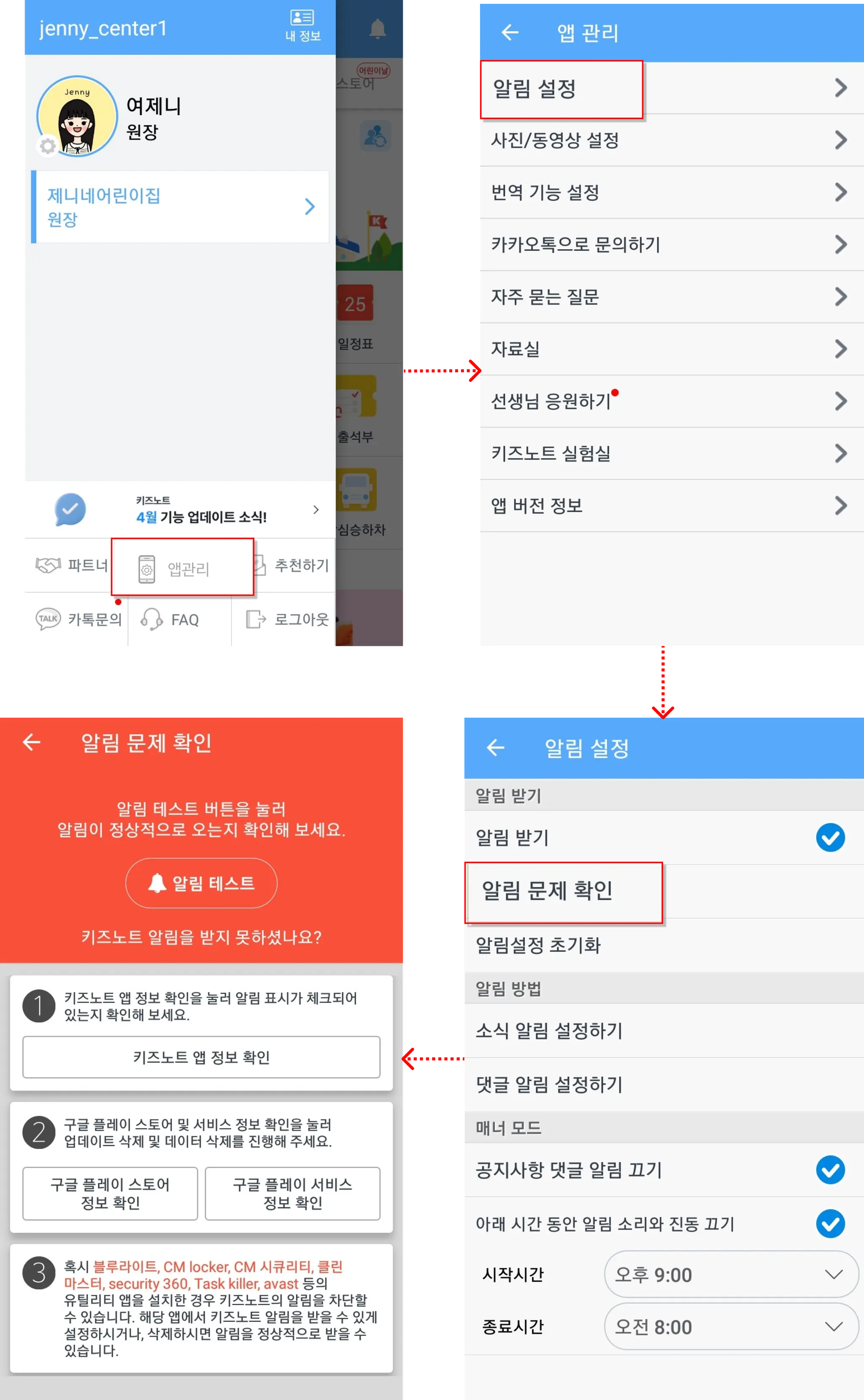 4. 키즈노트 실행 → 앱 관리 → 알림 문제 확인 → 알림 재설정