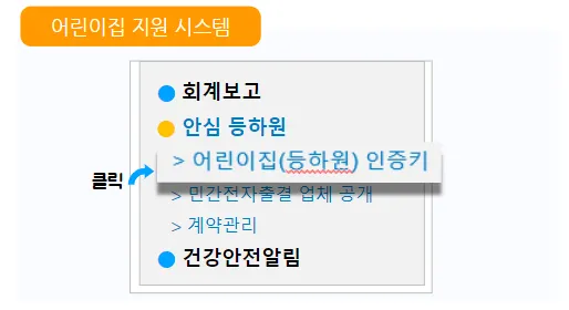 왼쪽 메뉴에서 안심 등하원 → 어린이집(등하원) 인증키 메뉴로 이동해 주세요.