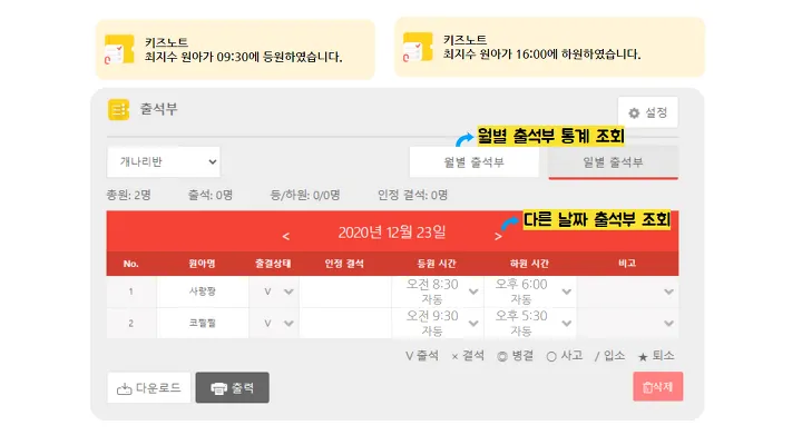 - 다른 날짜의 출석 현황과 월별 통계를 선택하여 조회할 수 있습니다.