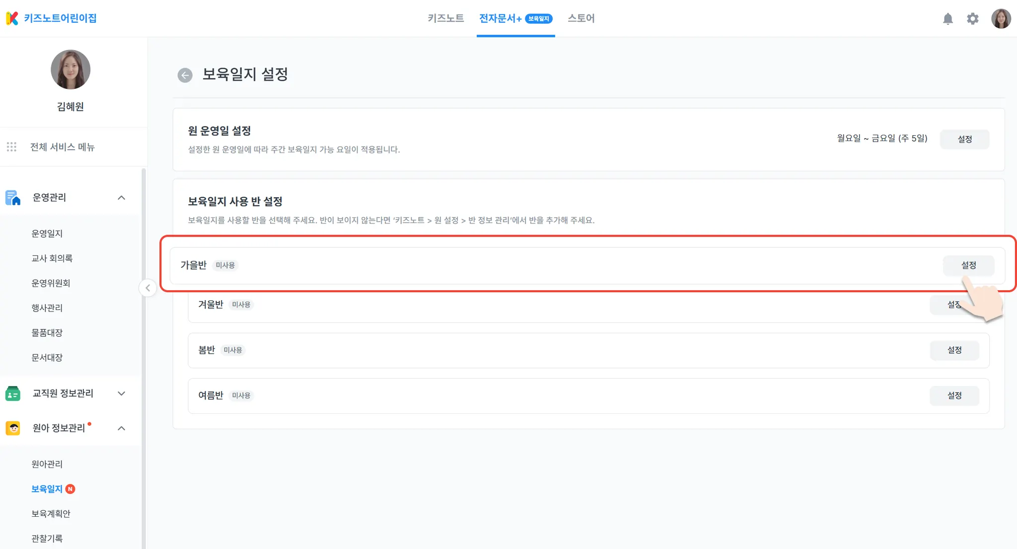 AI 컨설팅이 가능한 서식 형태로 보육일지를 작성하기 위해 반 별 설정 버튼을 선택한 후, 보육일지 서식을 설정해주세요.
