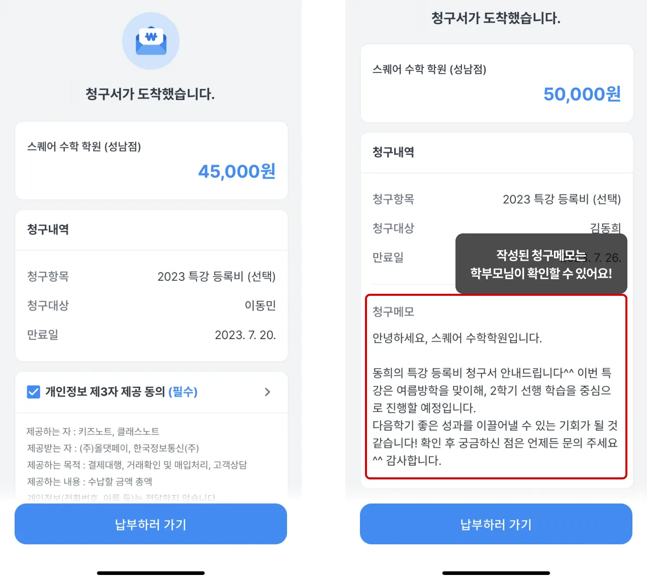 청구서 발송 시 학부모님께 전달할 내용이 있지는 않으셨나요?