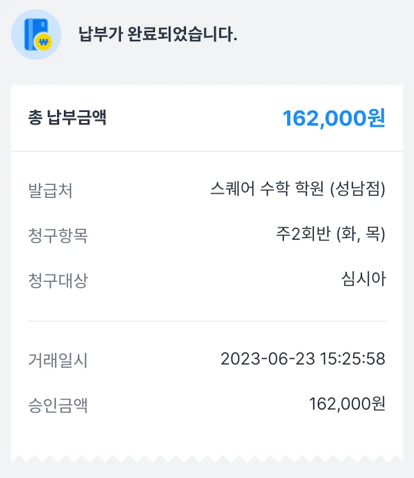 현장 수납이 완료되면, 학부모님께는 ‘수납 완료’로 앱 푸시 안내가 제공됩니다!