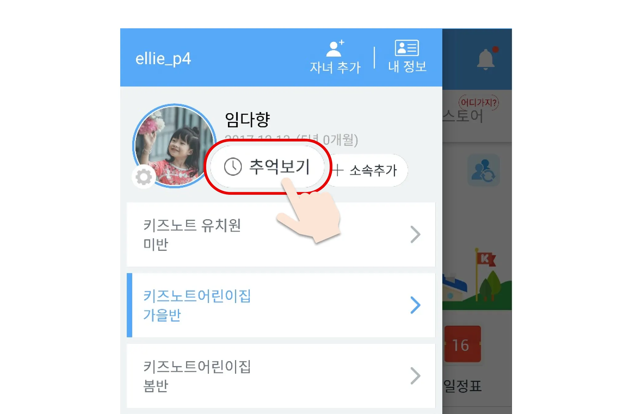키즈노트 메인 화면에서 좌측 상단의 세줄 아이콘을 클릭하면 자녀의 프로필 옆에 “추억보기”가 있어요.