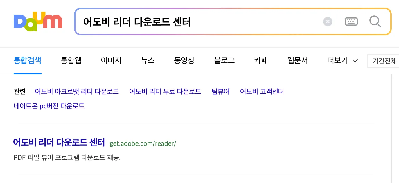 포털 사이트 검색창에 PDF 뷰어인 어도비 리더 다운로드 센터를 입력해 주세요.