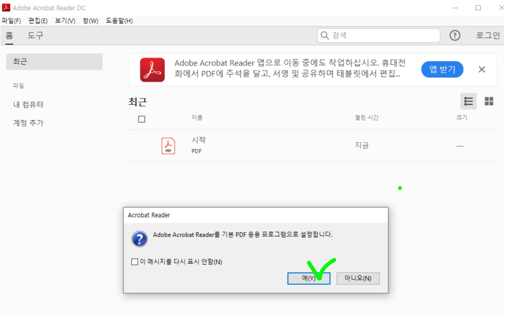 어도비 리더 프로그램을 실행 후, 기본 PDF 응용 프로그램 설정 여부를 묻는 팝업이 뜨면 예(Y) 버튼을 선택해주세요.