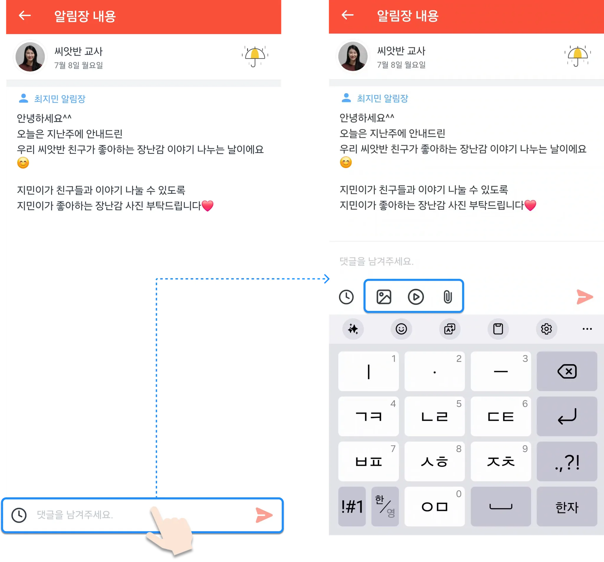 알림장 하단에 댓글창을 누르면, 사진·동영상·파일 첨부 버튼이 나타납니다.