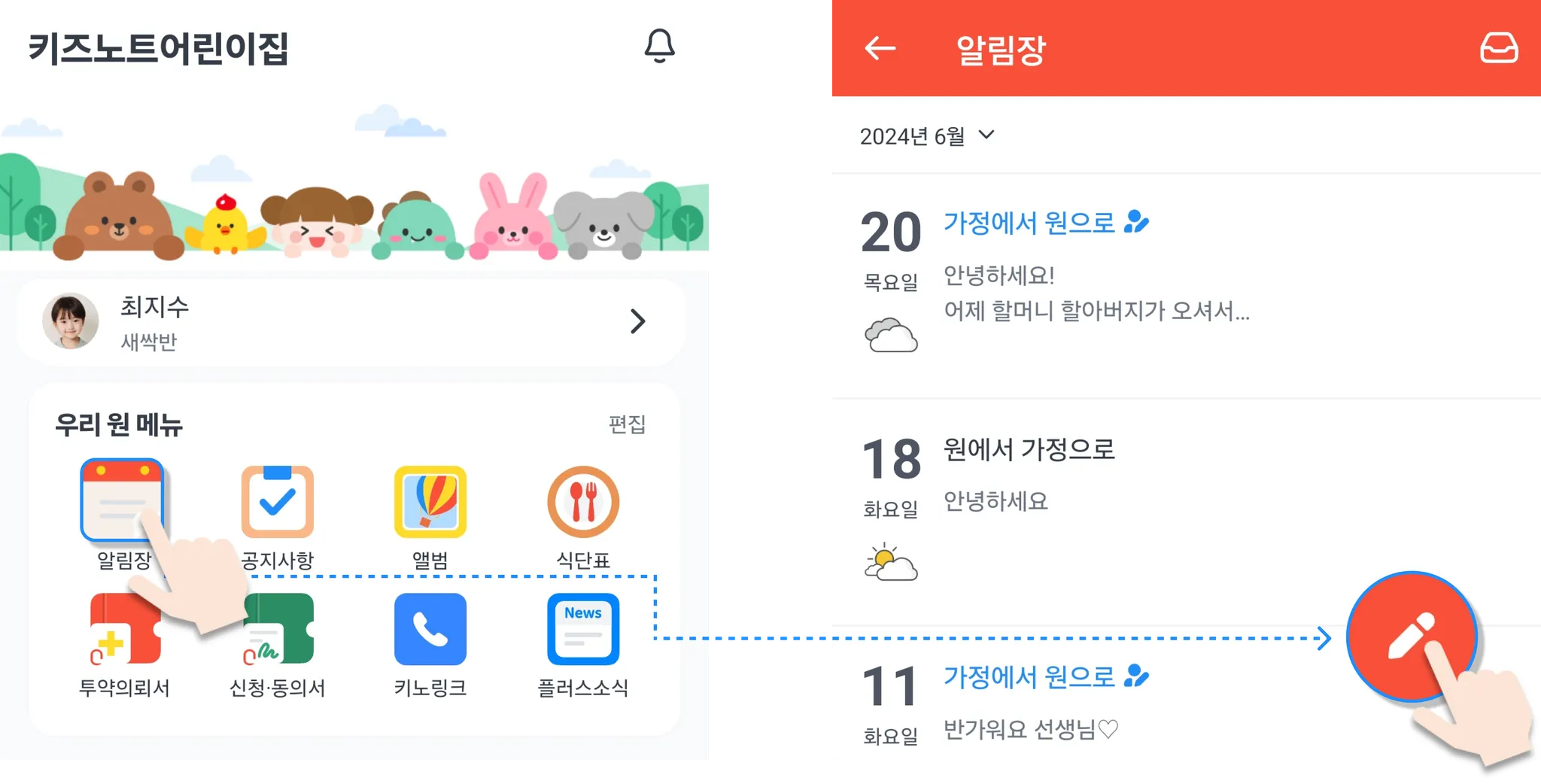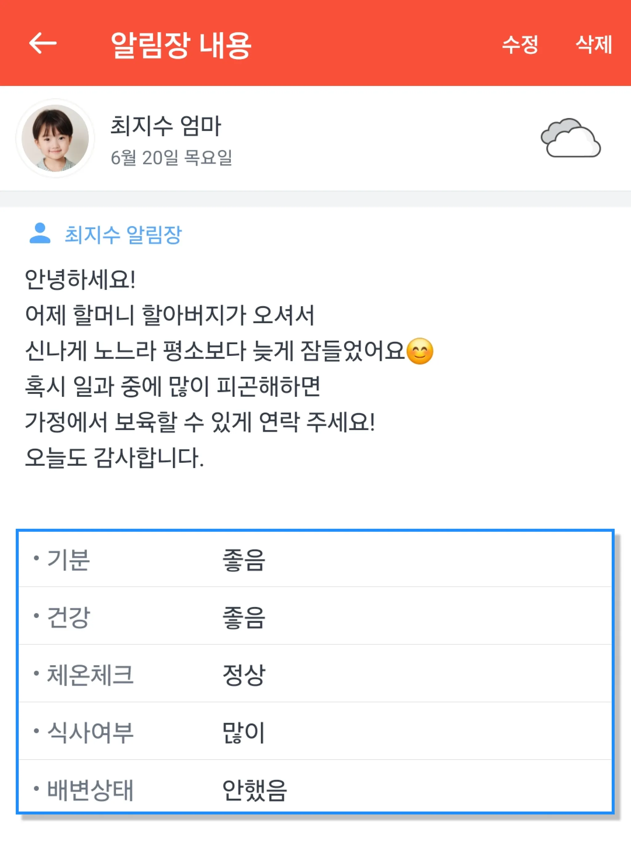 그리고 선생님께 아이의 기분과 컨디션, 어떤 고민이 있는 지 자세하게 알림장으로 알려주세요!