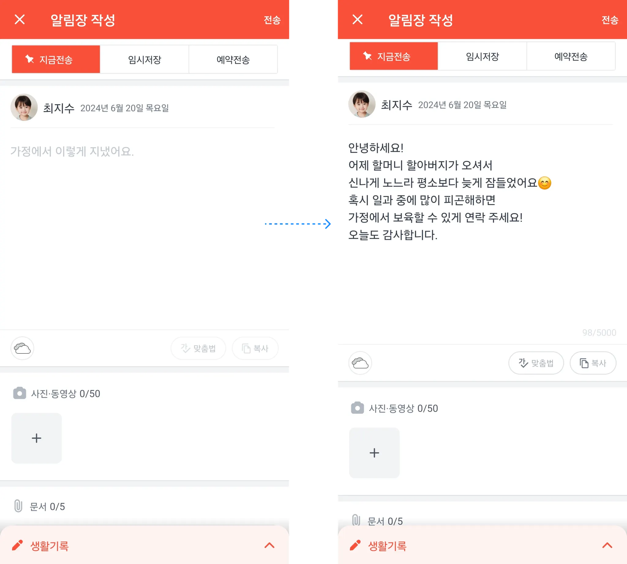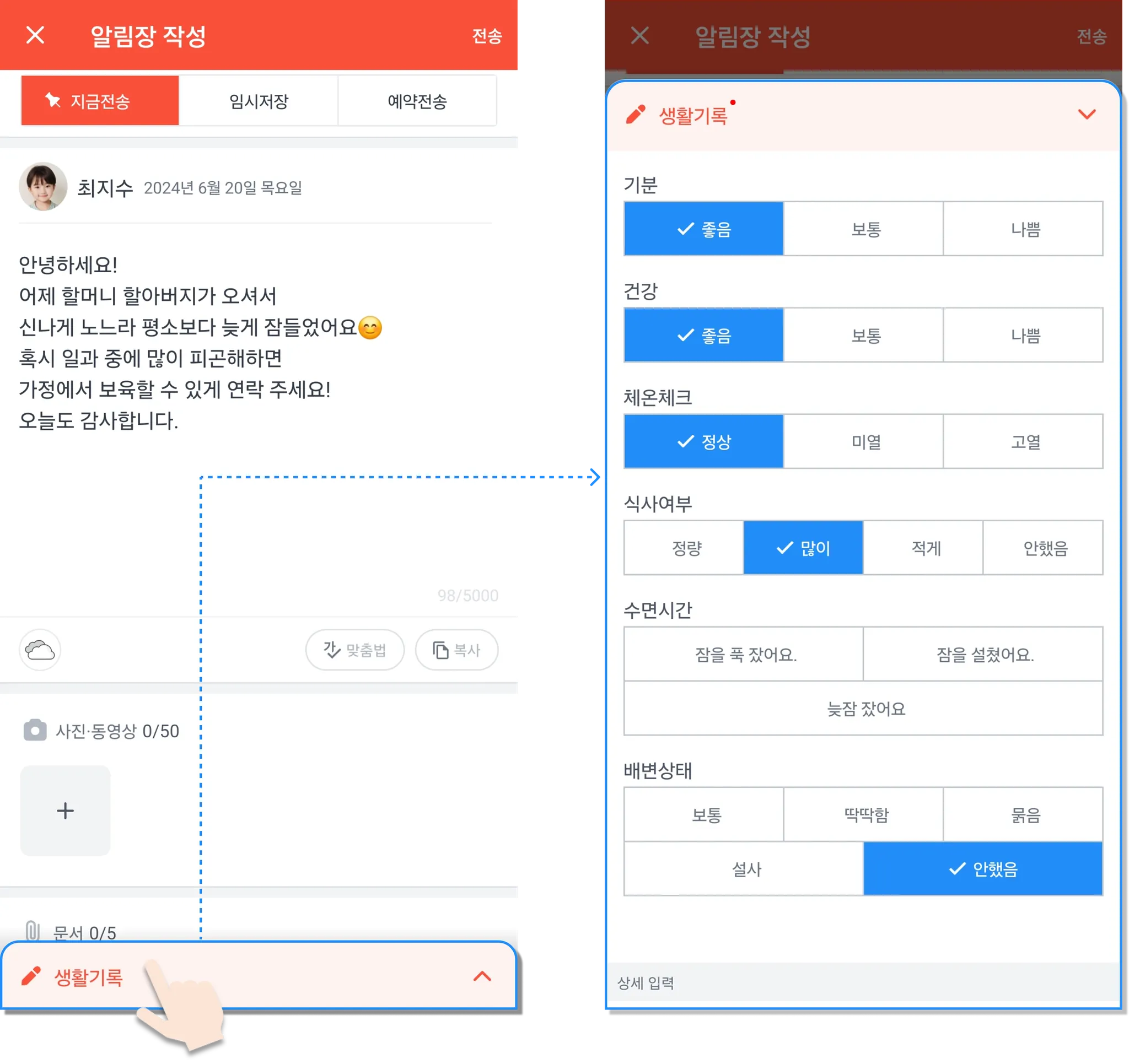 생활기록 버튼을 눌러 아이의 상태를 간단히 알릴 수 있어요.