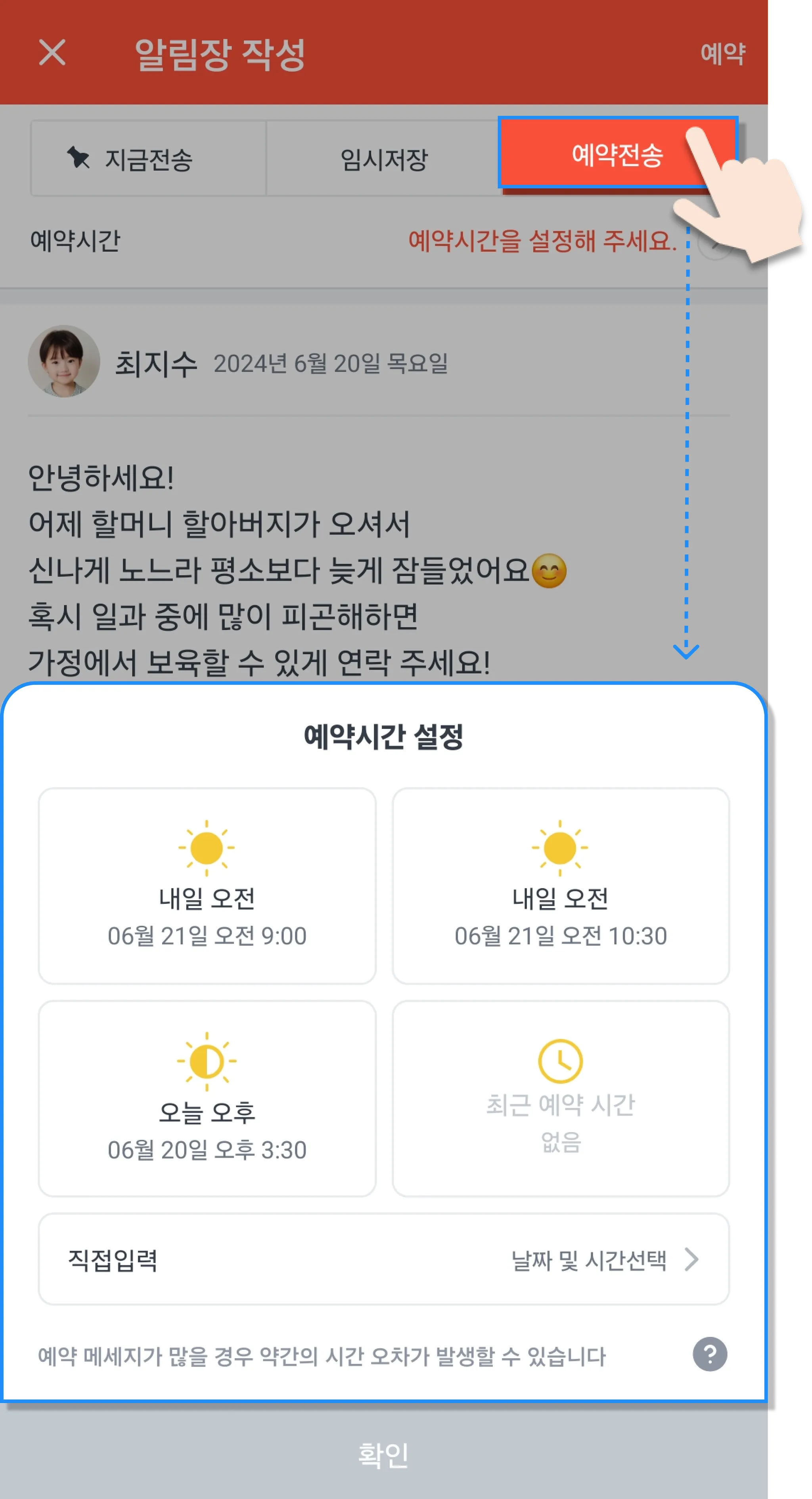 늦은 시간 알림장을 보내야 한다면, 예약전송을 이용해 보세요