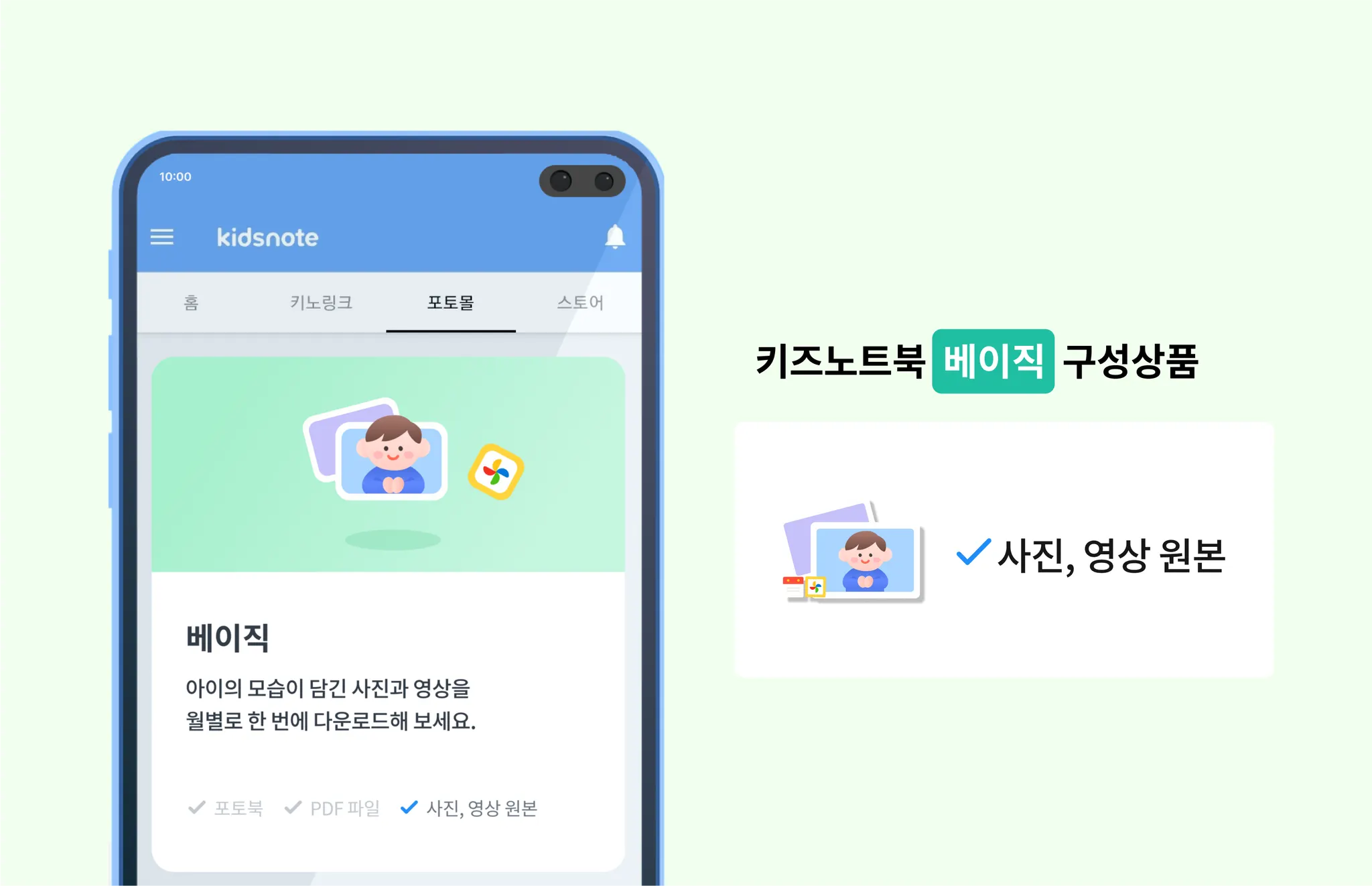 키즈노트북 베이직 서비스는 키즈노트 알림장과 앨범에 쌓여있는 우리 아이의 모든 사진동영상 원본을 월별로 모아 다운로드 할 수 있는 서비스 입니다.